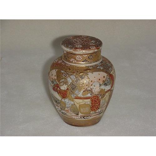 Satsuma Covered Jar. 4 1/8" tall x 3 1/4" in diameter. Top was broken in two, but has been glued back together. Signed inside top in oriental script, and on neck of jar.
