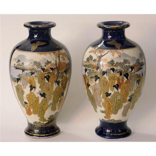 Pair of Satsuma vases decorated with two panels of geishas in a garden, one side of the vase shows the garden in spring and the other in autumn. The vases' background is cobalt blue decorated with gold butterflies. The Geishas have gold applications in relief. Both vases are marked at the base with a gold on black cross in a circle (mon) and a Japanese character mark, possibly the artist's signature (completely legible on one of the vases). Crackles are characteristic of Satsuma wares and part of their design. In good used condition with wear to gilt and minor restorations. Additional photos available upon request. Please send us an email before bidding with your state, country and zip code so we can estimate shipping charges to your location.
