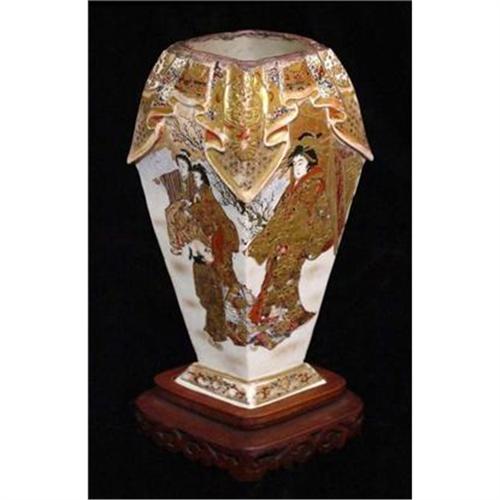 Rare Japanese Satsuma earthenware vase decorated with geisha and warrior figures. It is painted in shades of red, black and gold and decorated with an unusual draping around the top. Warrior figure decoration was incorporated to Satsuma ware in the late Edo period (1850-1860). The unglazed rim is also characteristic of this period. It is marked on the underside in red characters as shown. Comes with a custom-fitted carved wood base. In good used condition with wear to paint, crackle characteristic of Satsuma and small restoration to earthenware base. Please ask questions, request additional photos and shipping costs before buying.