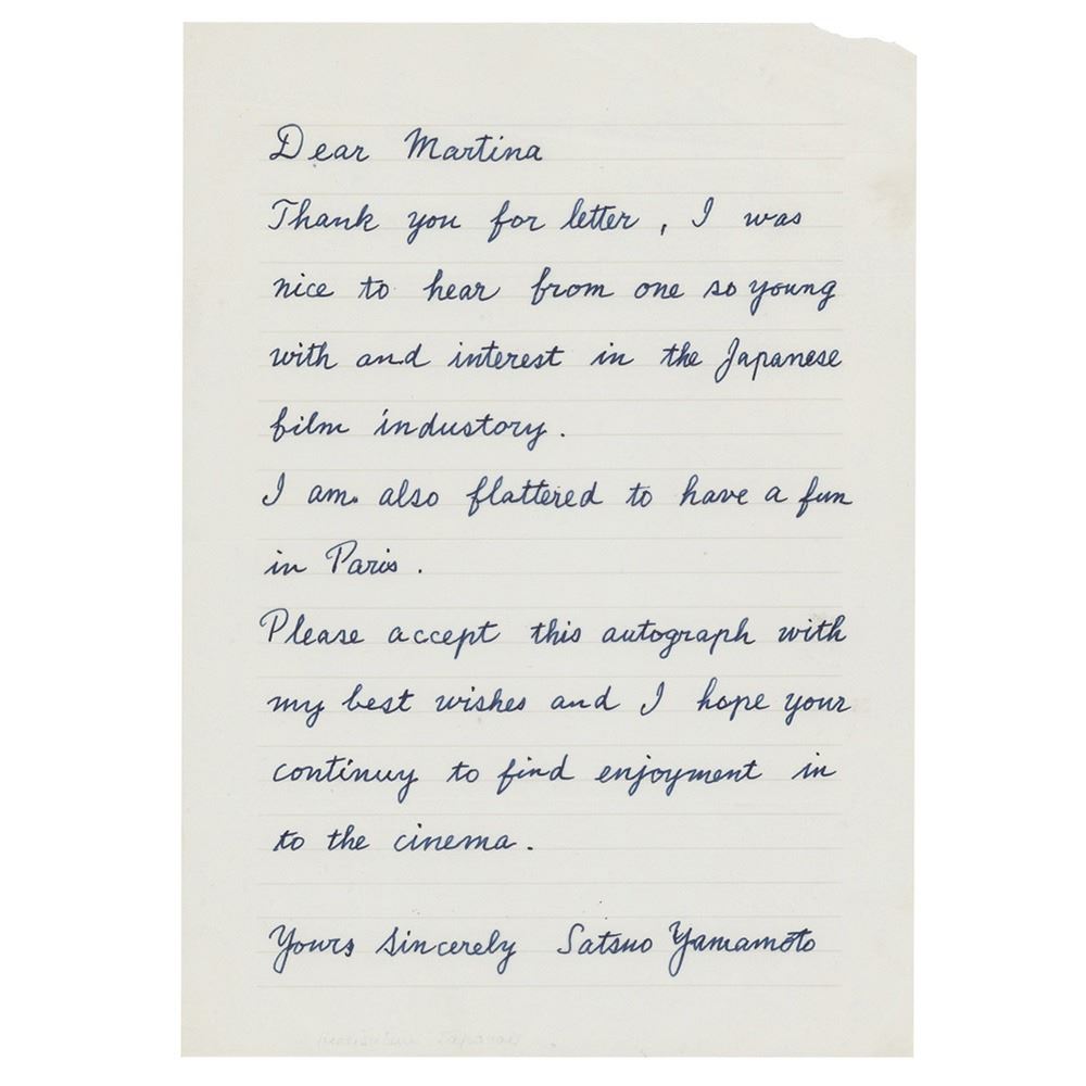 Rare ALS, one page, 7 x 10, no date. Handwritten letter to "Martina," in full (spelling and grammar retained): "Thank you for your letter, I was nice to hear from one so young with and interest in the Japanese film industory. I am also flattered to have a fun in Paris. Please accept this autograph with my best wishes and I hope your continuy to find enjoyment in to the cinema." In fine condition. The first item from the great Japanese director that we have ever offered.