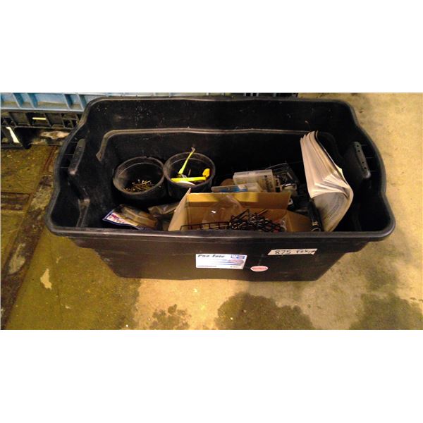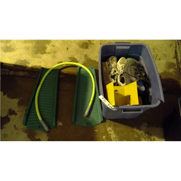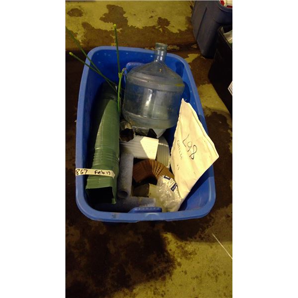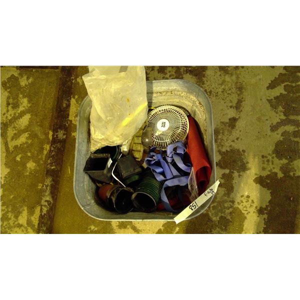 Tub with fan, misc. bolts/pins, strap and planting items and misc.