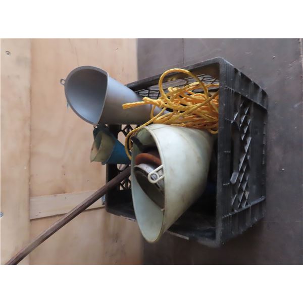 box of funnels and prybar