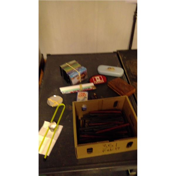 crayons, pencils, jaw harp, corn cob cutter and misc.