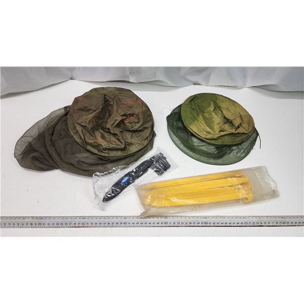 2 Camouflage, insect netting hats & tent pegs, etc.
