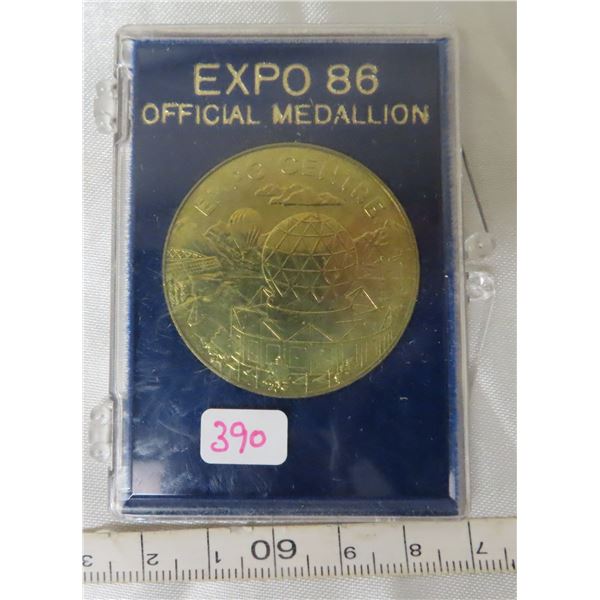 Expo 86 Official Medallion. Housed in a hard plastic holder.
