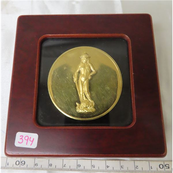 David medal by Donatello. Massive gold-plated brass medal weighs 116.2 grams. Housed in a wooden cas