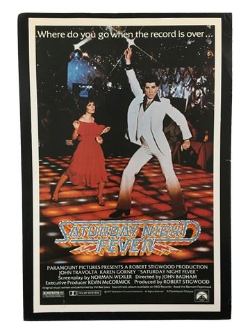 Saturday Night Fever (Paramount Pictures, 1977). Window card. Starring: John Travolta and Karen Lynn Gorney. There are creases, marks, stains, paper loss and edge wear damage. Very Fine. (14" X 21.5").