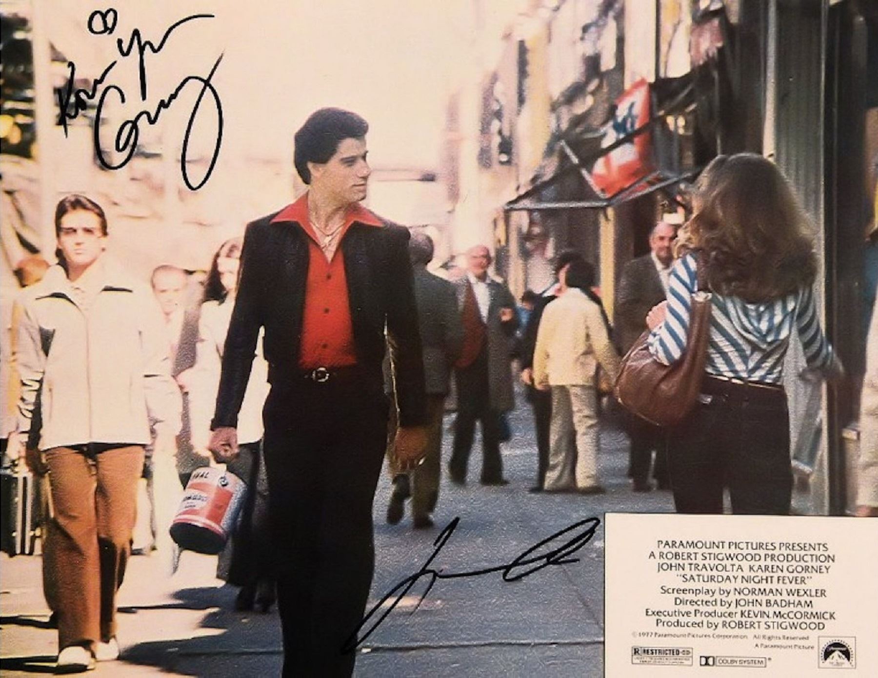 Saturday Night Fever signed original lobby card autographed by John Travolta and Karen Lynn Gorney. 11x14 inches