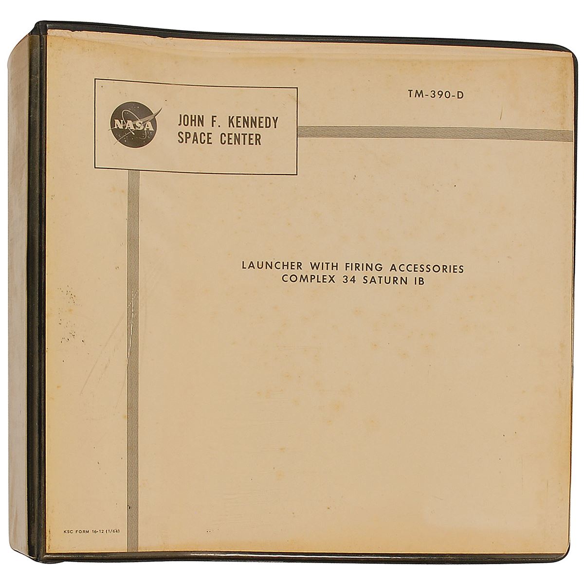 Original spiral-bound manual from the John F. Kennedy Space Center, titled “Launcher with Firing Accessories Complex 34 Saturn 1B,” dated September 1, 1965, 11.75 x 11. The heavily illustrated manual, as stated in the introduction, “provides guidelines for preparing the launcher with firing accessories for the Saturn IB vehicles at Launch Complex 34.” In very good condition, with scattered toning, heavier to the front cover.