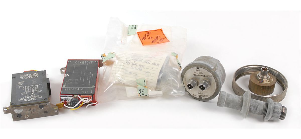 Collection of seven pieces of ground support hardware: a Saturn adapter assembly, serial no. 0000023, housed in its original clean room packaging, with Pur-O-Lator and Boeing labels affixed to the outside of the packaging; and six various miscellaneous electrical and hardware components. In fine condition.