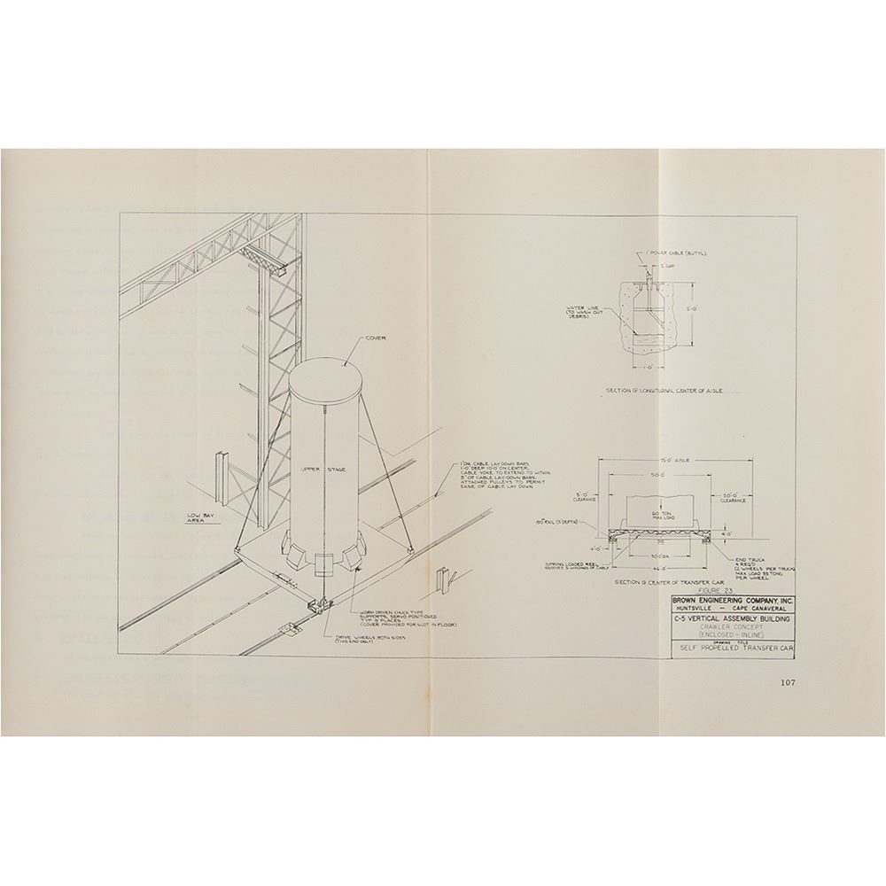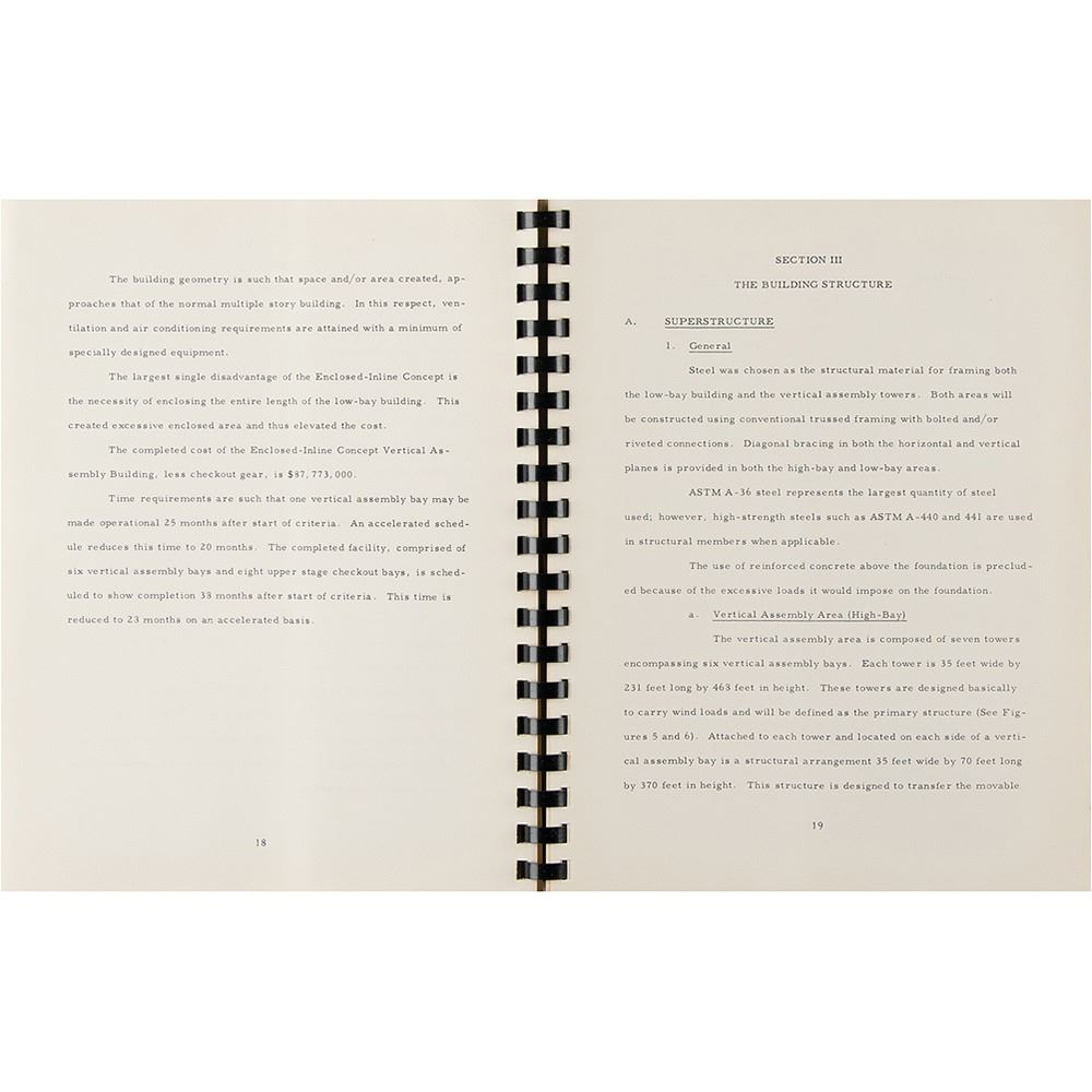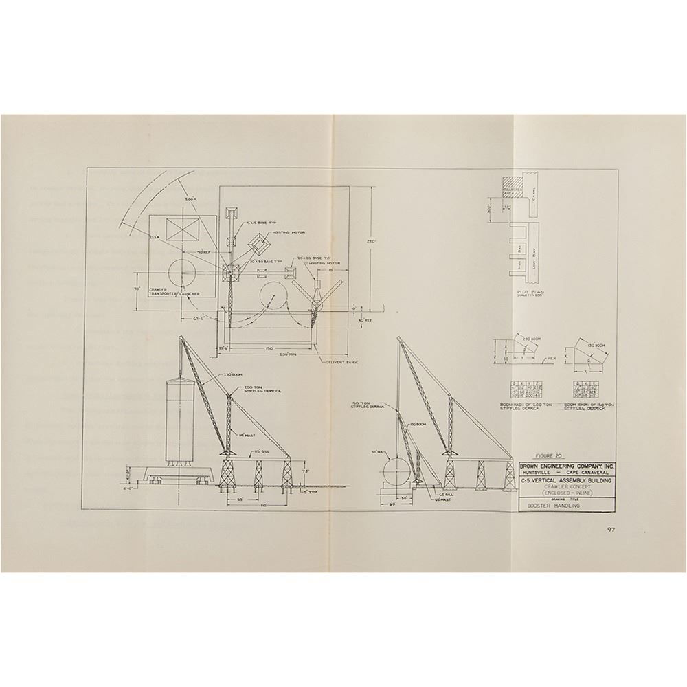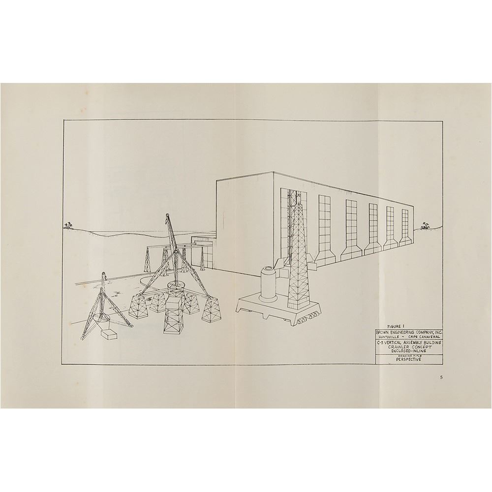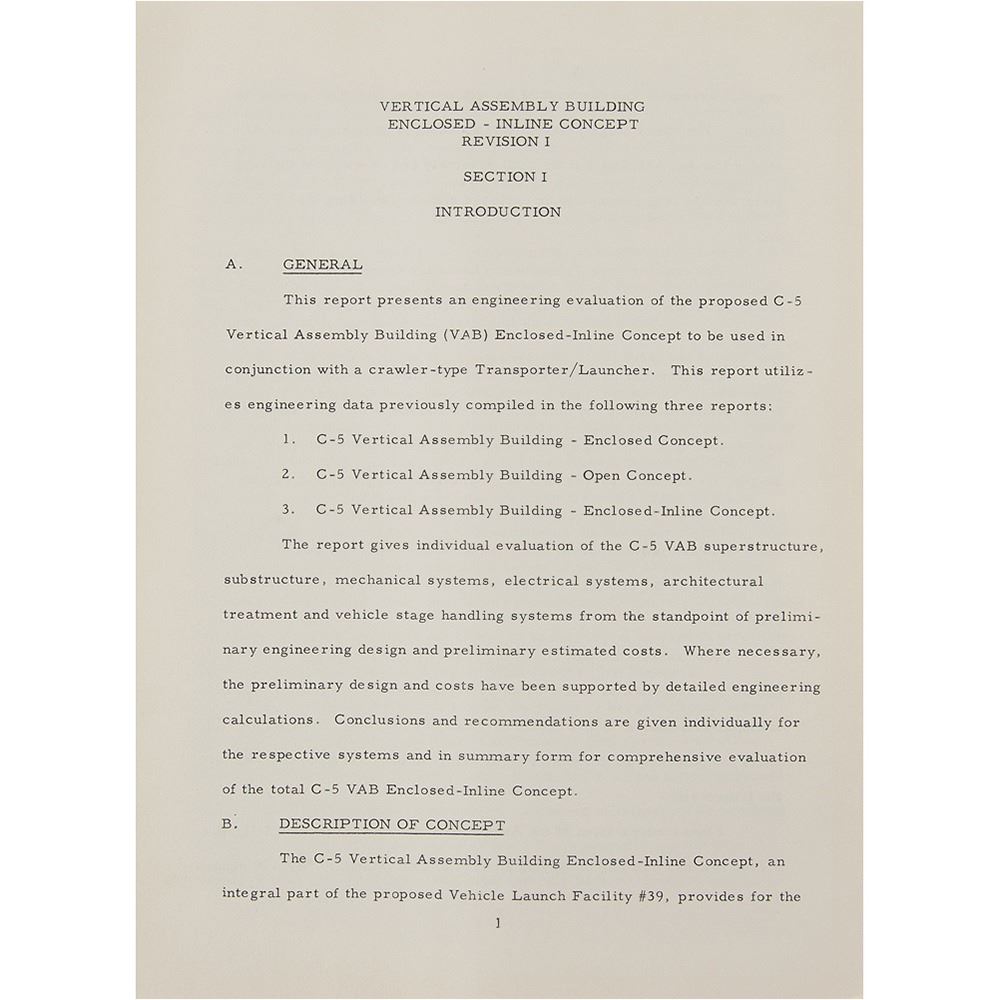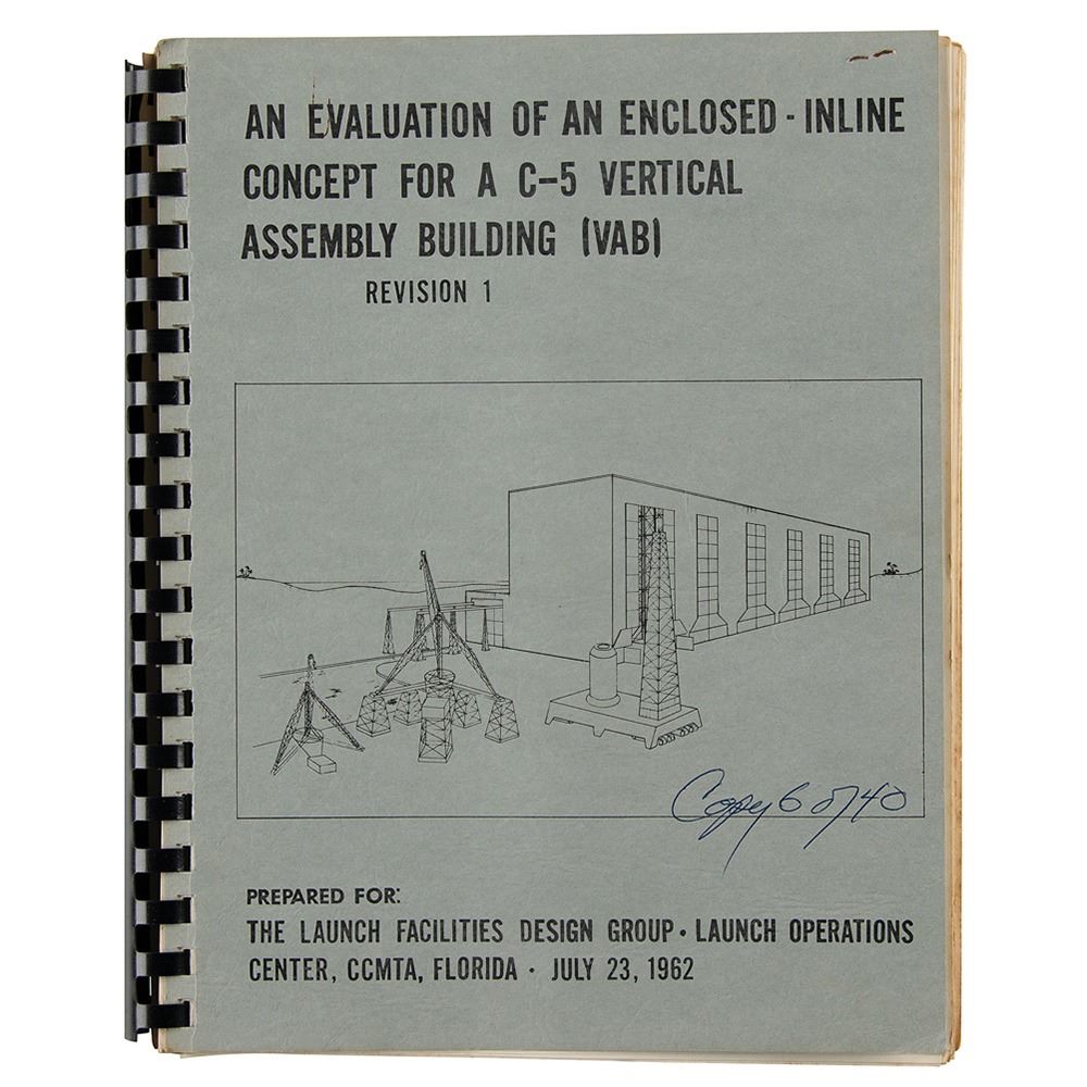 Rare spiral-bound report entitled "An Evaluation of an Enclosed-Inline Concept for a C-5 Vertical Assembly Building (VAB), Revision 1," prepared for the Launch Facilities Design Group, 180 pages, 9 x 11, dated July 3, 1962. The front cover is annotated "Copy 6 of 40," and a partial distribution list is stapled inside the front cover. The report presents an engineering evaluation of the C-5 Vertical Assembly Building (VAB) Enclosed-Inline Concept to be used in conjunction with a crawler-type Transporter/Launcher, offering an evaluation of the structure, systems, preliminary design, and estimated costs. In addition to summarizing the project in total, the report includes a number of interesting fold-out drawings and schematics detailing the proposed building, crawler, and associated systems. A fifty-page appendix outlines the calculations, assumptions, and estimates used in creating the report. In fine condition.