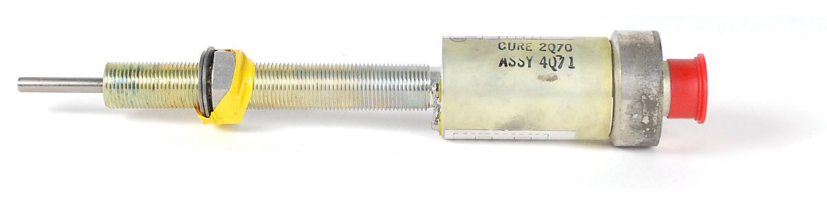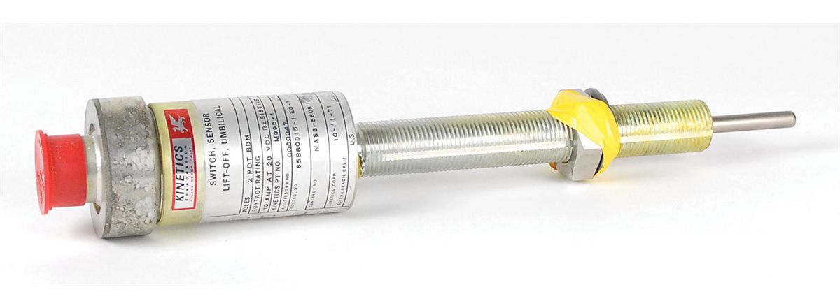 Apollo Saturn launch umbilical switch and sensor assembly. Component measures 11? long, with an affixed Kinetics Corporation label identifying the part, “Switch, Sensor Lift-Off, Umbilical…10-11-71,” with several inspectors stamps to the lower right. In fine condition. This switch would command release of a particular launch pad umbilical away from the Apollo Saturn rocket when lift-off motion was detected.
