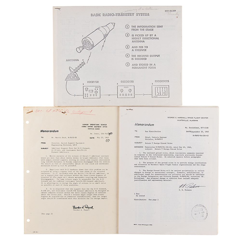 Official NASA memoranda regarding the Saturn Rocket, 8.5 x 11, consisting of a one-page Launch Operations Center memo regarding analysis of the "Umbilical Support Foot for S-II Forward, S-IVB Aft, and Instrument Unit/S-IVB Forward Umbilicals" (May 23, 1963), a 34-page copy of the George C. Marshall Space Flight Center's "Saturn V Design Ground Rules" (September 30, 1963), and packets of copied diagrams pertaining to the "Basic Radio-Telemetry System," "S-IVB Propellant Tank Pressurization System," and "S-IVB Explosive Separation Joint." In very good to fine condition.