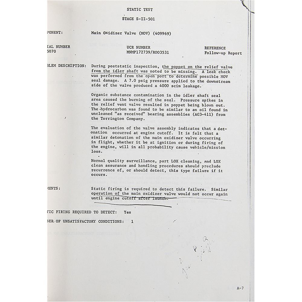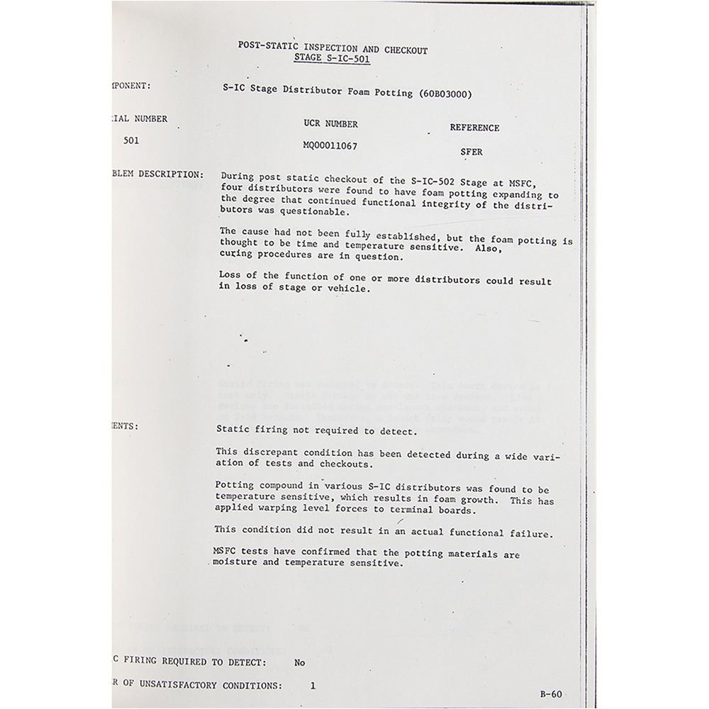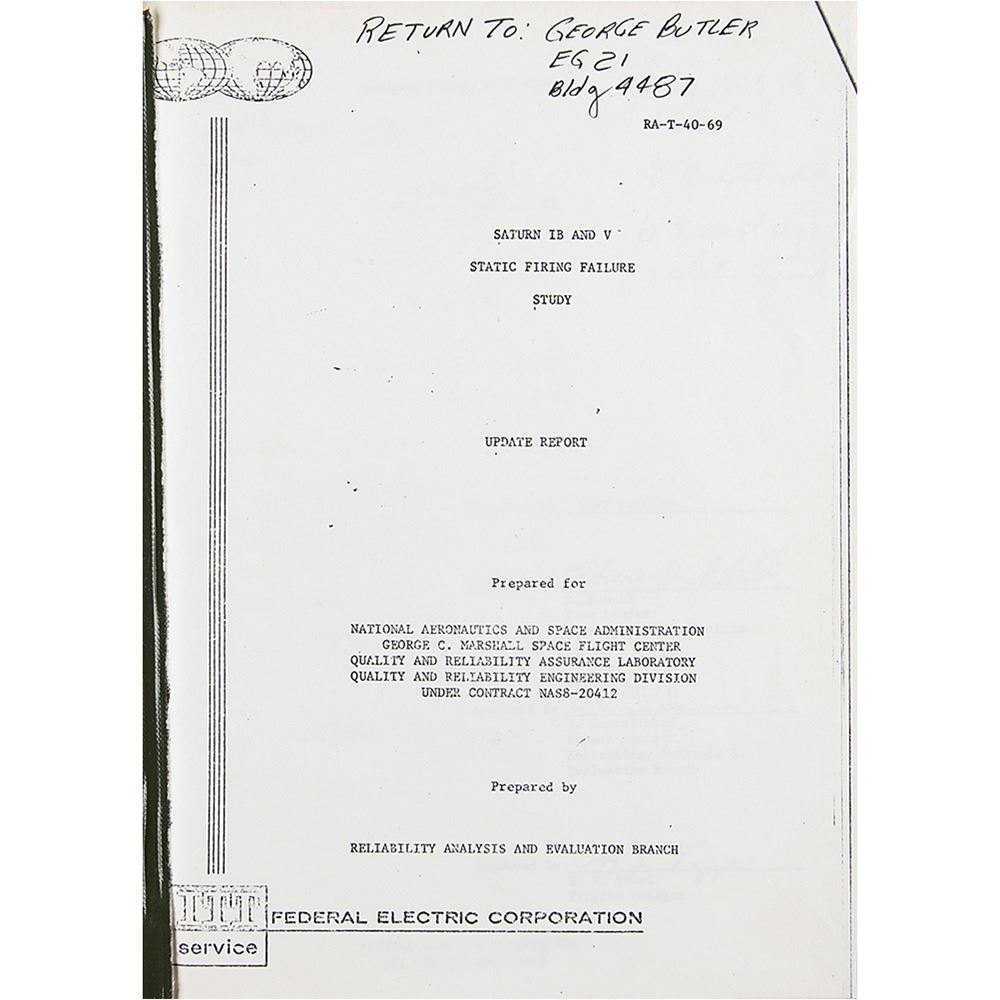 Official bracket-bound ITT Service / Federal Electric Corporation manual entitled ‰ÛÏSaturn IB and V Static Firing Failure Study, Update Report,‰Û prepared by Reliability Analysis and Evaluation Branch for NASA‰Ûªs Quality and Reliability Laboratory and Division at the Marshall Space Flight Center. The manual, 9 x 11.5, over 200 pages, dated April 14, 1969, contains an introduction section with objective, scope, and approach chapters, a discussion section with chapters for the Saturn IB and Saturn V vehicles, and three large appendices for ‰ÛÏFailures Requiring Static Firing,‰Û ‰ÛÏFailures Not Requiring Static Firing,‰Û and ‰ÛÏNon-Static Firing Failures.‰Û The spine is marked in felt tip, ‰ÛÏApollo Failures.‰Û The consignor notes that the manual is an official copy of the MSFC Propulsion Systems Department. In fine condition.