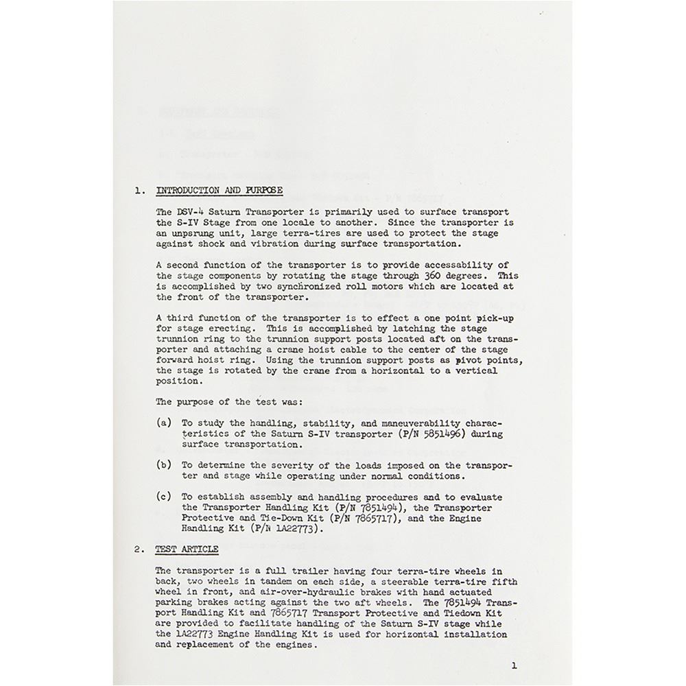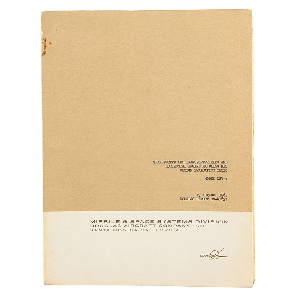 Softcover report entitled "Transporter and Transporter Kits and Horizontal Engine Handling Kit Design Evaluation Tests, Model No. DSV-4" prepared for NASA by the Douglas Aircraft Company's Missile & Space Systems Division, 77 pages, 8.5 x 11.25, August 19, 1963. The report describes and illustrates the tests performed on the DSV-4 transporter, designed to haul the Saturn S-IV stage from one locale to another. It concludes that the transporter, transporter handling kit, and engine handling kit satisfactorily completed all tests, but performance of the protective and tie-down kit (environmental covers) was unsatisfactory. In fine condition.