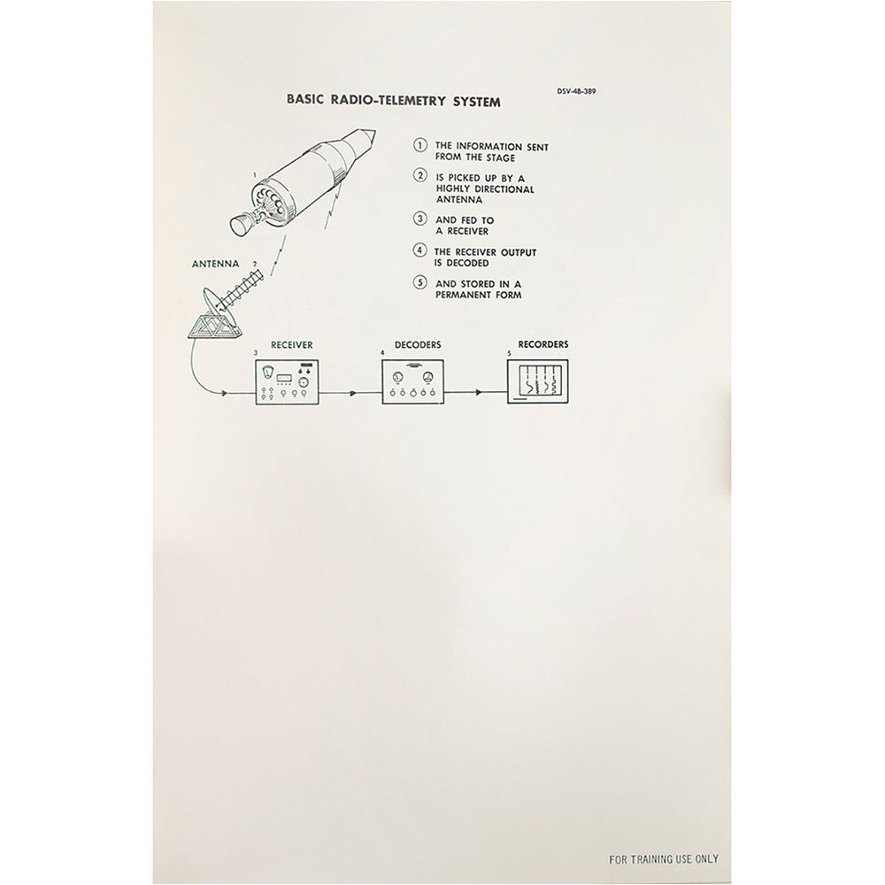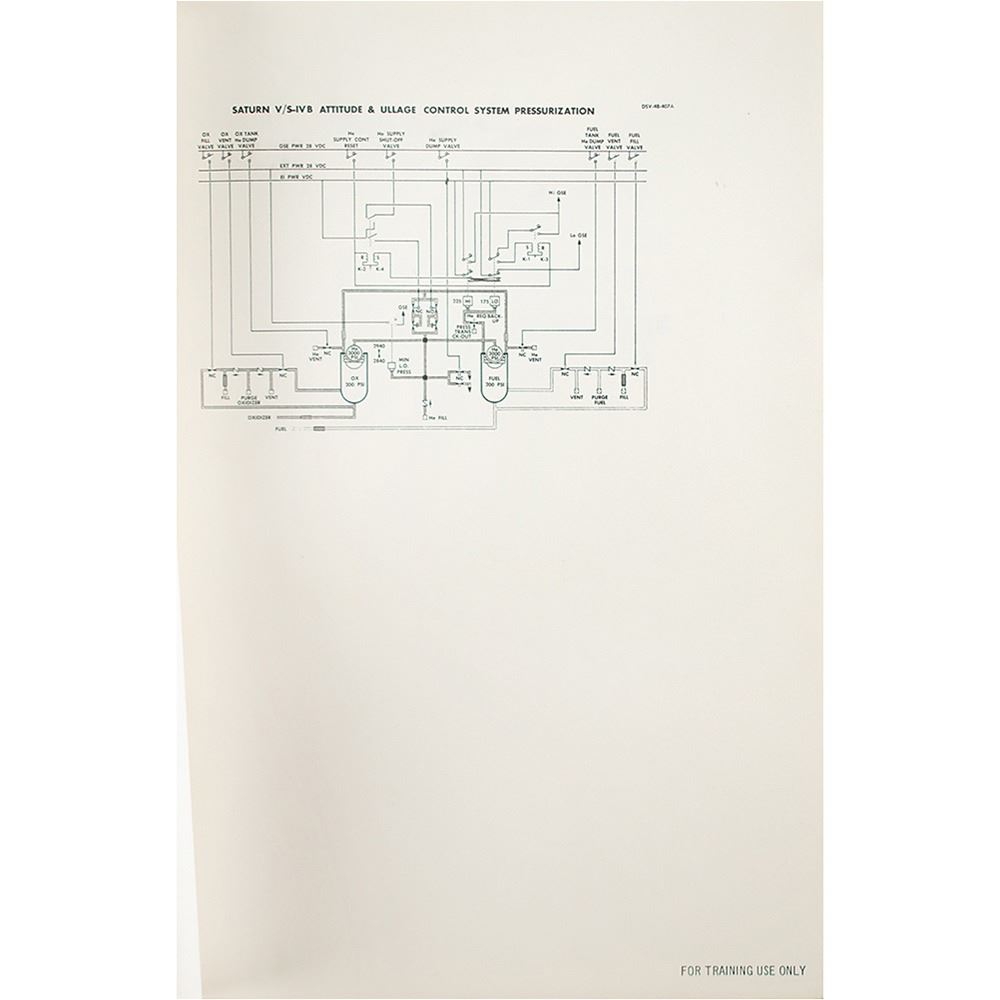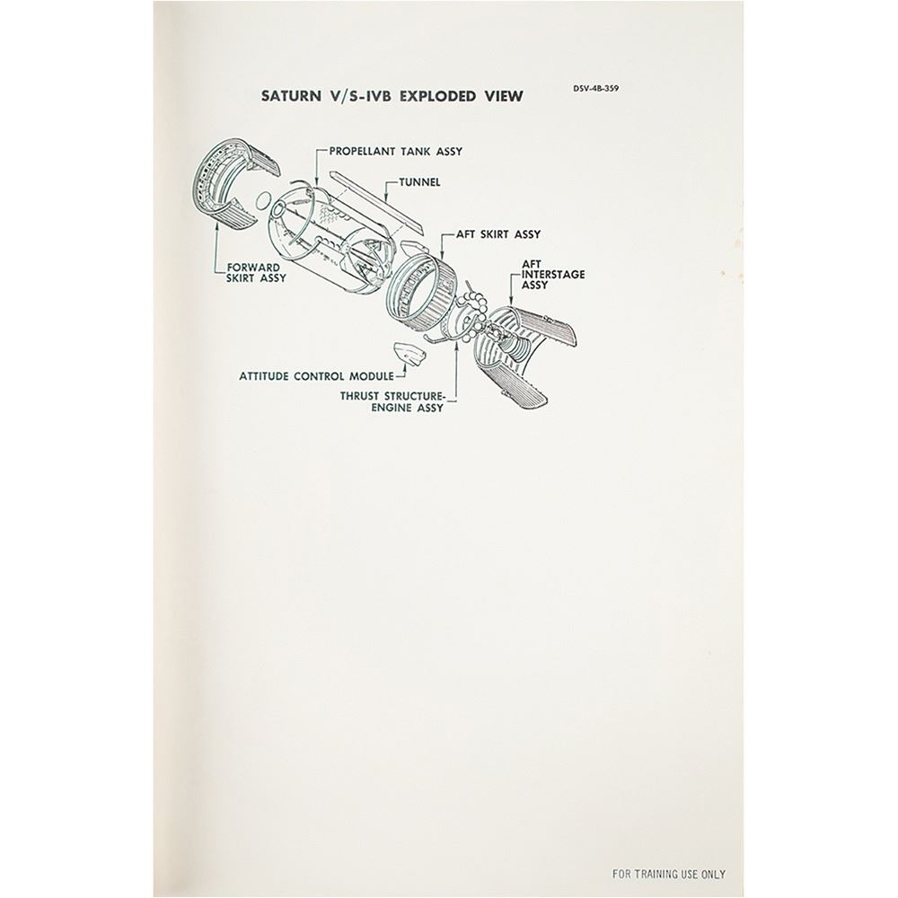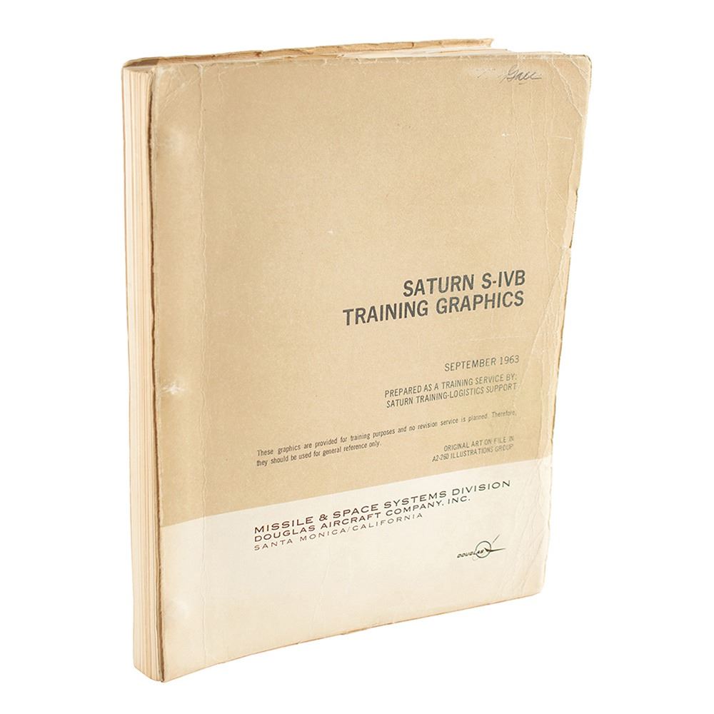 Early brad-bound softcover handbook entitled "Saturn S-IVB Training Graphics," prepared by the Missile & Space Systems Division of the Douglas Aircraft Company, 8.75 x 11.25, dated September 1963. Labeled "For Training Use Only," the book consists almost entirely of simplified diagrams, drawings, and schematics documenting the Saturn S-IVB (third stage on the Saturn V launch vehicle), organized into tabs for the various systems and subsystems: "Structures," "Manufacturing," "Electrical," "Hydraulics," "J-2 Propulsion," "Propellant Utilization," "Auxiliary Propulsion," "Ordnance, " "Instr. & Telemetry," "Automatic GSE," "General GSE," and "Countdown & Mission." The "J-2 Propulsion" section is empty, with a single page noting that the material is "Classified Confidential." In very good to fine condition, with wear to the tabs and moderate creasing to the covers.