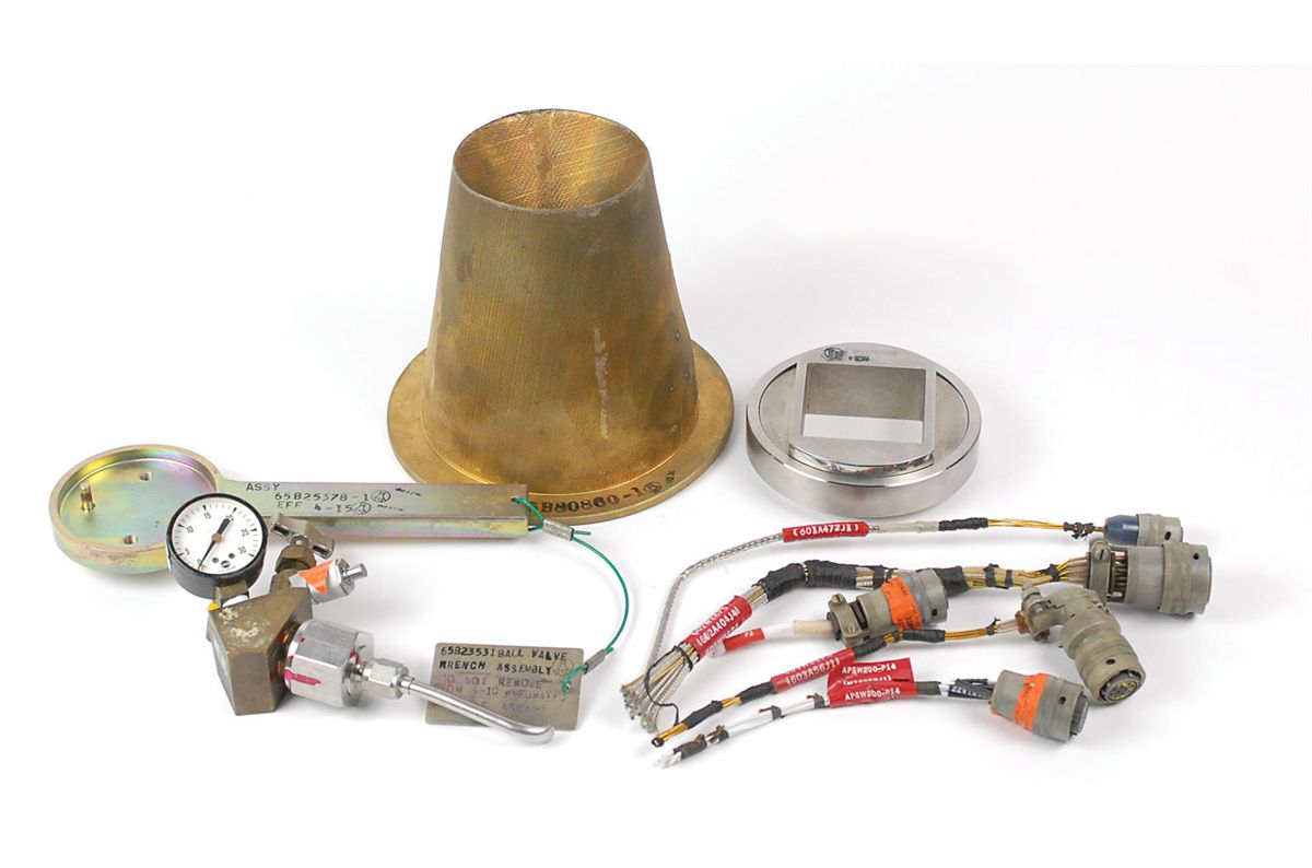 Collection of five pieces of ground support hardware. First, a ball valve assembly wrench, 8.5? long, with a recessed circular fitting at the head. A metal tag is attached by a wire cord to the other end and is labeled, “Ball Valve Wrench Assembly, Do not remove from S-1C pneumatic console area.” Second, is a metallic gold conical filter, 6? tall, with “ASSY 65B80860-1,” stenciled along the bottom rim. Third, a pressure gauge assembly, 7.5? long, with a NASA label on the reverse and a cleaning specification label, dated October 25, 1974, affixed along the edge of the gauge. Fourth, is a set of five McDonnell Douglas electrical connectors, various lengths, each with a red parts label around the wires. Finally, a heavy 4.5? diameter fitting with a 2.25 x 2.25 rotating square fitting in the center, possibly for use with a wrench or other tool. In fine condition.