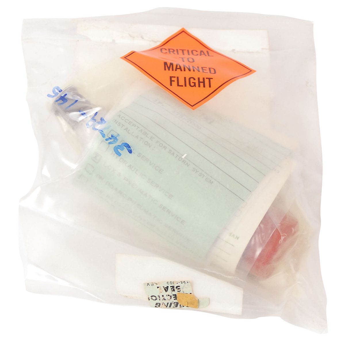 Saturn socket assembly affiliated for the Saturn V S-IC (first stage) system. Made by Pur-o-Later the assembly measures 5.5? long and is labeled “Socket Assembly…Ser. No. 0000235…Assy Date 1Q66.” Part is housed in its clean room inner packaging and is accompanied by its outer packaging with its Pur-o-Later label affixed to one side. Also included are two cleaning tags, dated 1966 and 1971. In fine condition.