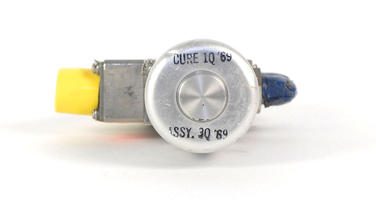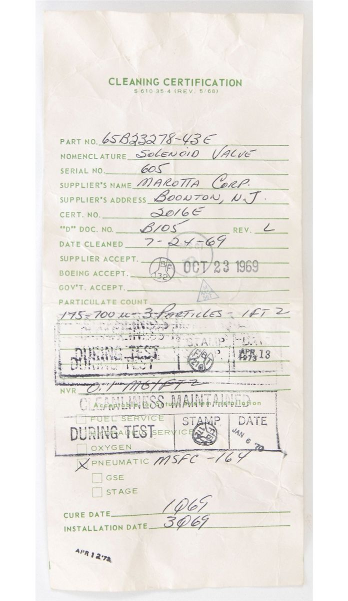 Saturn pneumatic solenoid valve measuring approximately 4? x 3.75.? A George C. Marshall Space Flight Center label is affixed to the upper portion of the valve, and is labeled, “3 Way, 2 Position Solenoid Valve…Serial No. 605,” with several inspectors stamps to upper portion and a Marotta Valve Corp. label affixed to the lower portion. A small bright orange “Critical to Manned Flight” label is affixed near one of the openings. Accompanied by its cleaning certification, filled out in a technician’s hand, with several stamps dating from 1969–1970. In fine condition.