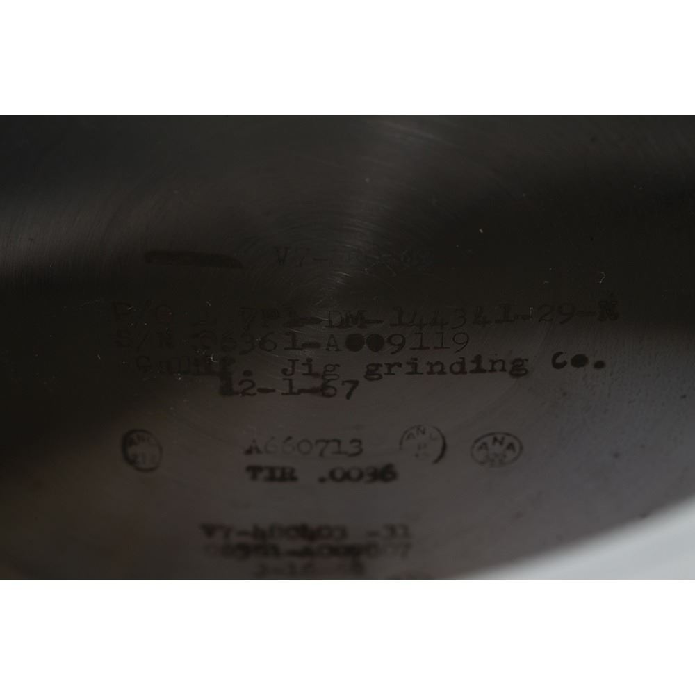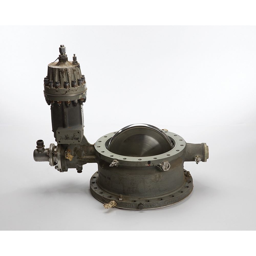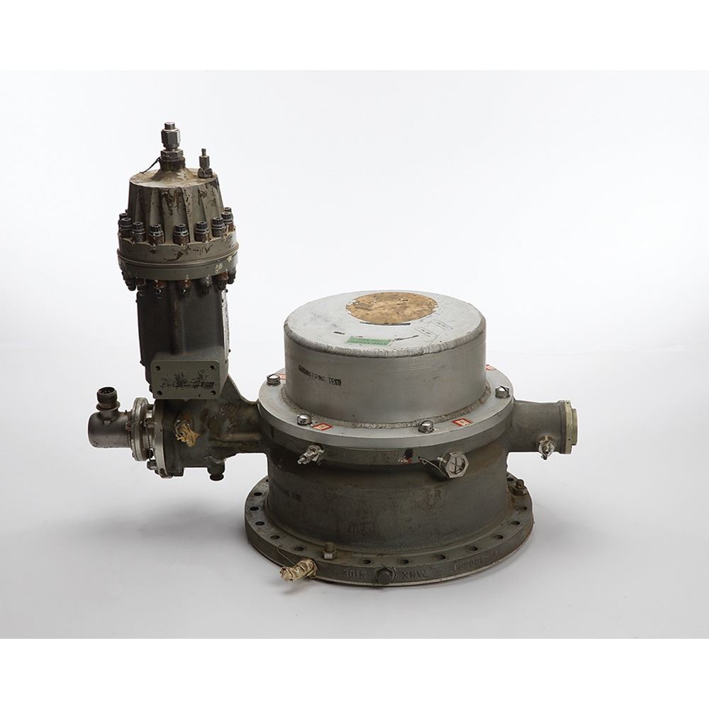 Large Saturn V second stage S-2 oxidizer shutoff valve used as engineering test hardware, measuring 21Àù x 12Àù x 18Àù, marked on a black tag: "Part No. V7480701-P3, Foundry Ident & Ser No. FRAM211, Heat No. TF94M, X-Ray No. 00935, Ht. Source & Batch No. 60D797." A green label on top reads: "For LO2 Service Only." The sides are stenciled, "Engineering Test." The shutoff valve regulated flow of liquid oxygen into one of five S-II stage J2 rocket engines. In very good to fine condition.