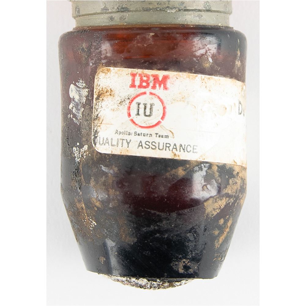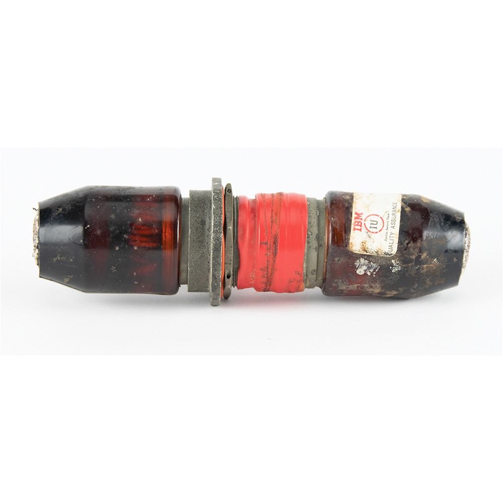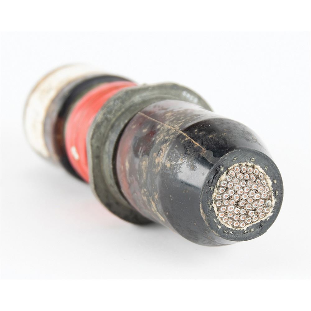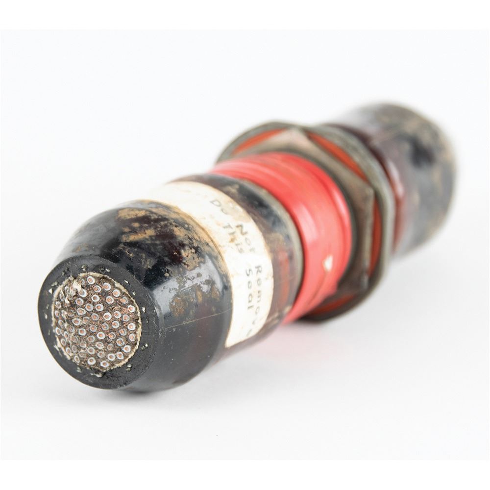 Saturn V Instrument Unit (IU) IBM power/signal connection assembly, measuring approximately 7Ë long and 2Ë in diameter, with one complete IBM IU seal at the end and the center wrapped in red plastic tape. The thick multi-conductor cables at either end have been severed.