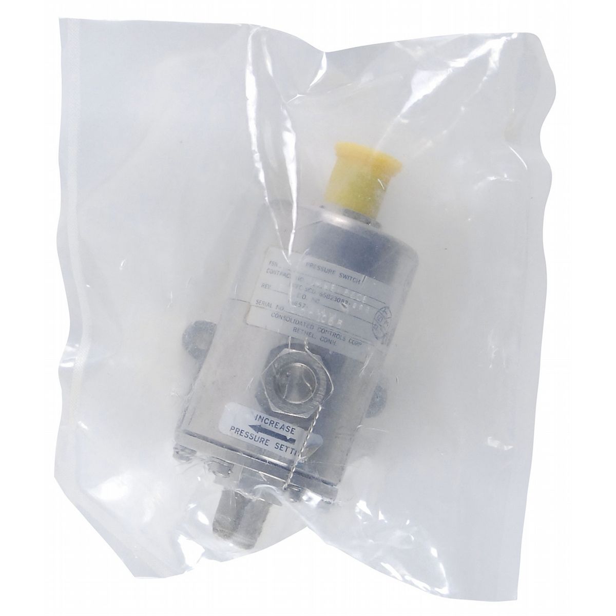 Saturn V SI-C First Stage Pressure Switch from Boeing. Calibrated pressure switch, serial no. 0001065 and NASA contract no. 8-5608, measures 4.5? long has Boeing markings for the Saturn V first stage. Switch comes with its original two-layer plastic bag packaging intact (the outer bag, complete with Boeing seals dated December 1967, was previously opened for inspection; switch remains sealed in its the inner bag. In fine condition. SI-C parts are uncommon as they were only used on the Saturn V.