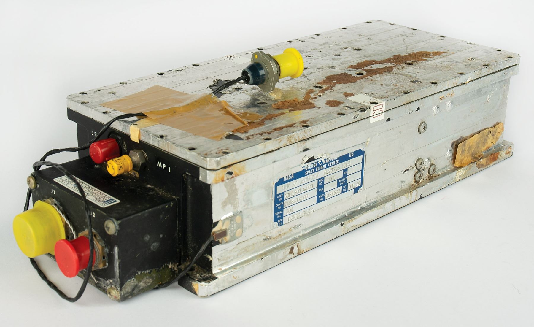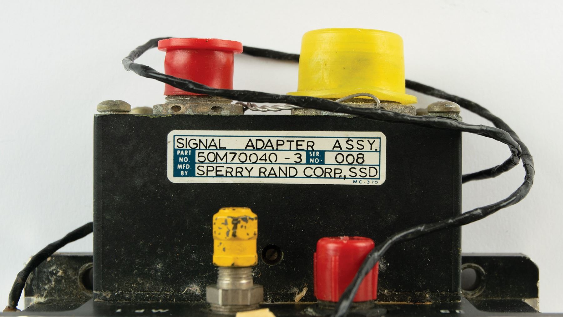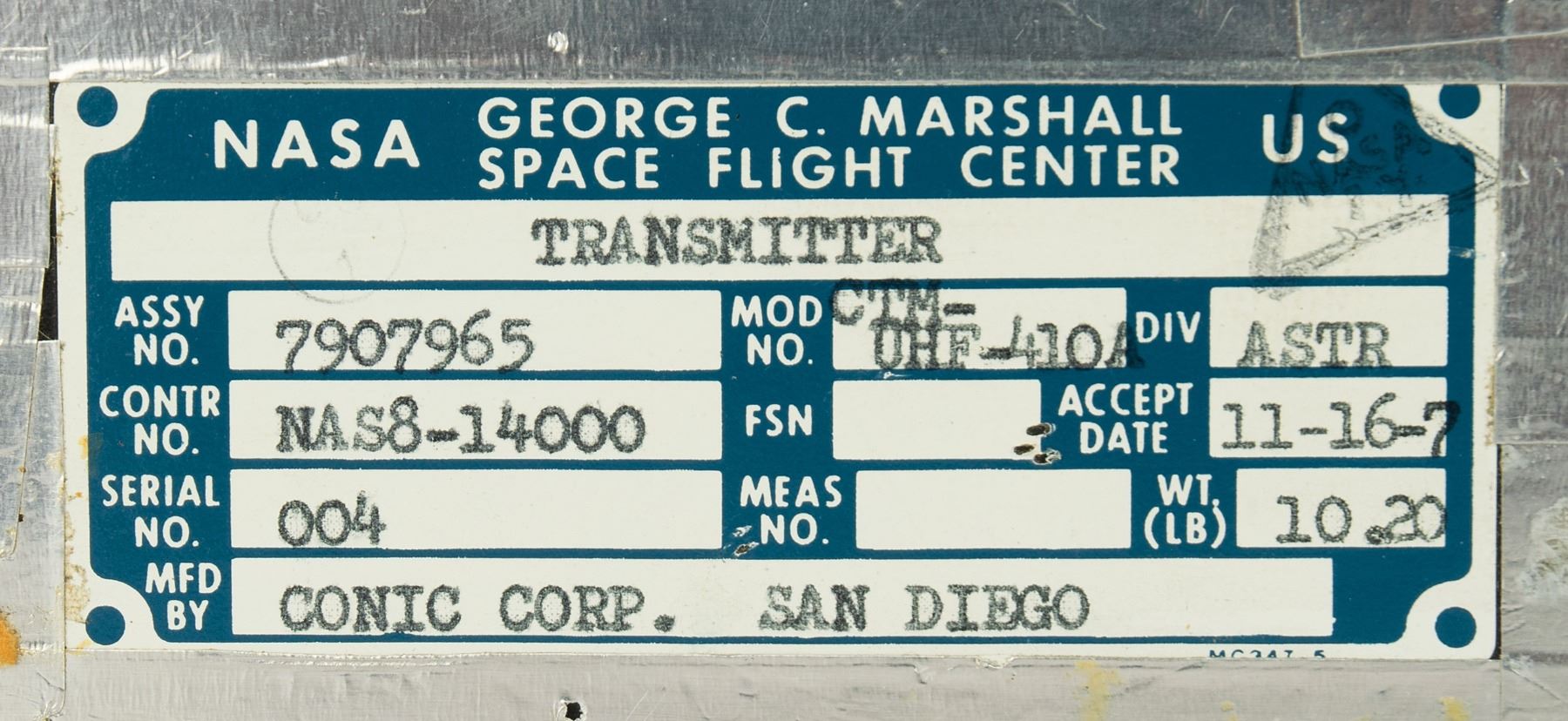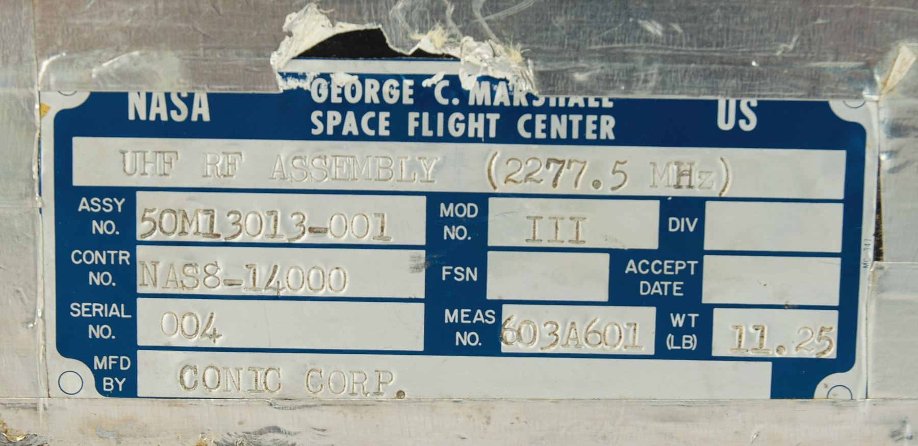 Saturn V UHF transmitter, measuring 14˝ x 5.5˝ x 3.25˝, with NASA/George C. Marshall Space Flight Center tags on two sides, in part: "Transmitter, Assy No. 7907965, Contr No. NAS8-14000, Serial No. 004, Mfd. by Conic Corp, San Diego, Mod. No. CTM-UHF-410A" and "UHF RF Assembly (2277.5 Mhz), Assy No. 50M13013-001, Contr No. NAS8-14000, Serial No. 004." This is an engineering evaluation unit, with a connector taped to the top for two temperature monitoring thermistors glued to the case. Attached at one end is a signal adapter, with tag reading: "Part No. 50M70040-3, Ser No. 008, Sperry Rand Corp." In very good to fine condition, with some peeling to the aluminized tape covering the unit's body.