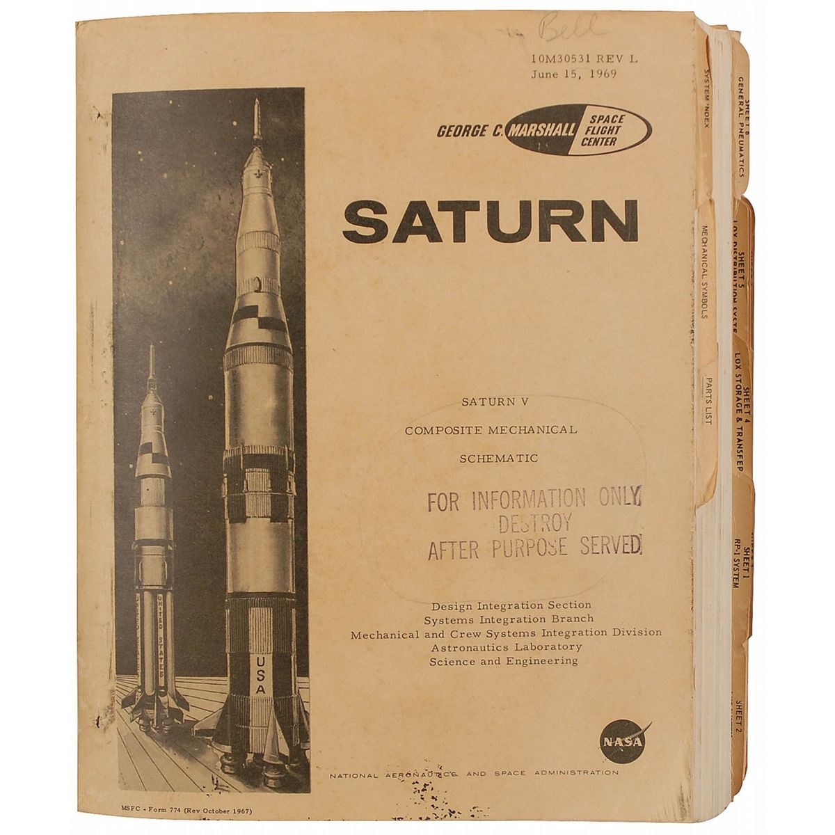 Saturn V Composite Mechanical Schematic, 10M30531 Rev. L, 8.5 x 11, 416 pages, June 15, 1969. Impressively thick manual consisting of tabbed sections containing a complete parts list and schematics for various rocket systems. Front cover bears a “For Information Only Destroy After Purpose Served” stamp. In very good condition, with scattered foxing, toning, and soiling to the covers, and a couple pencil notations to the front cover.