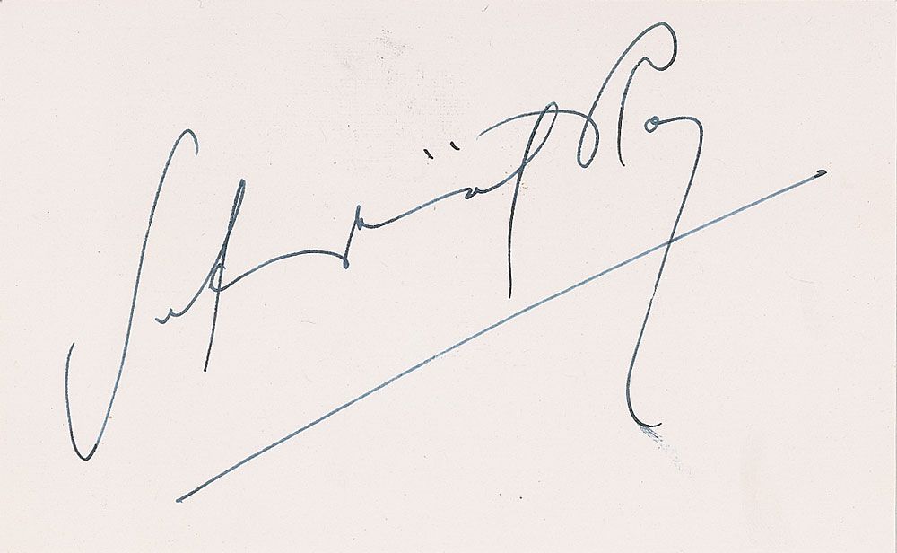 Indian filmmaker (1921–1992) regarded as one of the greatest auteurs of 20th century cinema. Felt tip signature, “Satyajit Ray,” on an off-white 5.5 x 3.5 card. In fine condition.