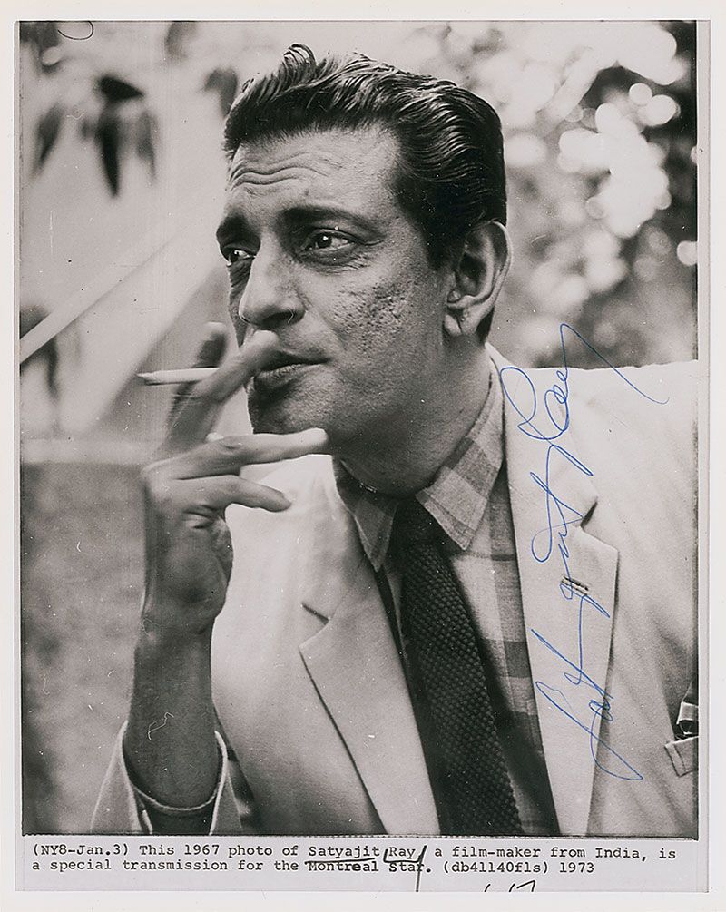 Indian filmmaker (1921–1992) regarded as one of the greatest auteurs of 20th century cinema. Glossy 8 x 10 photo of Ray taking a drag on his cigarette, signed vertically in blue ballpoint. In fine condition.