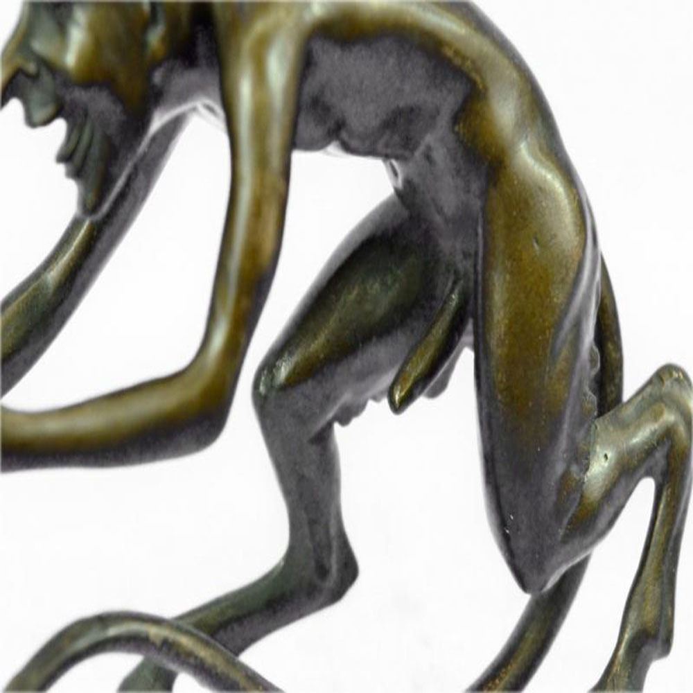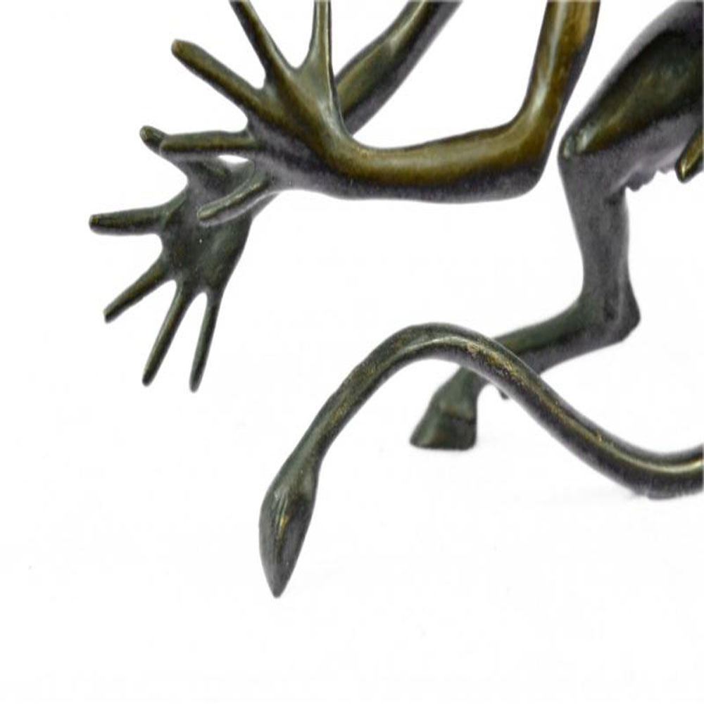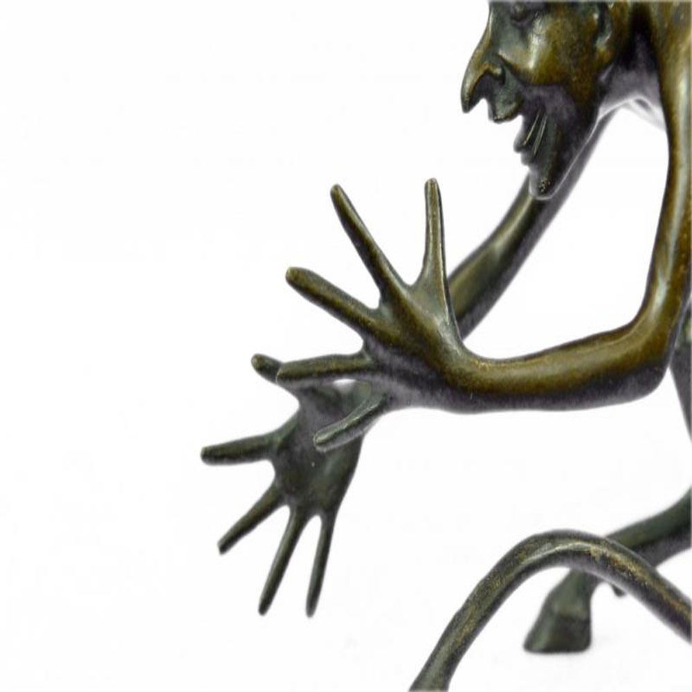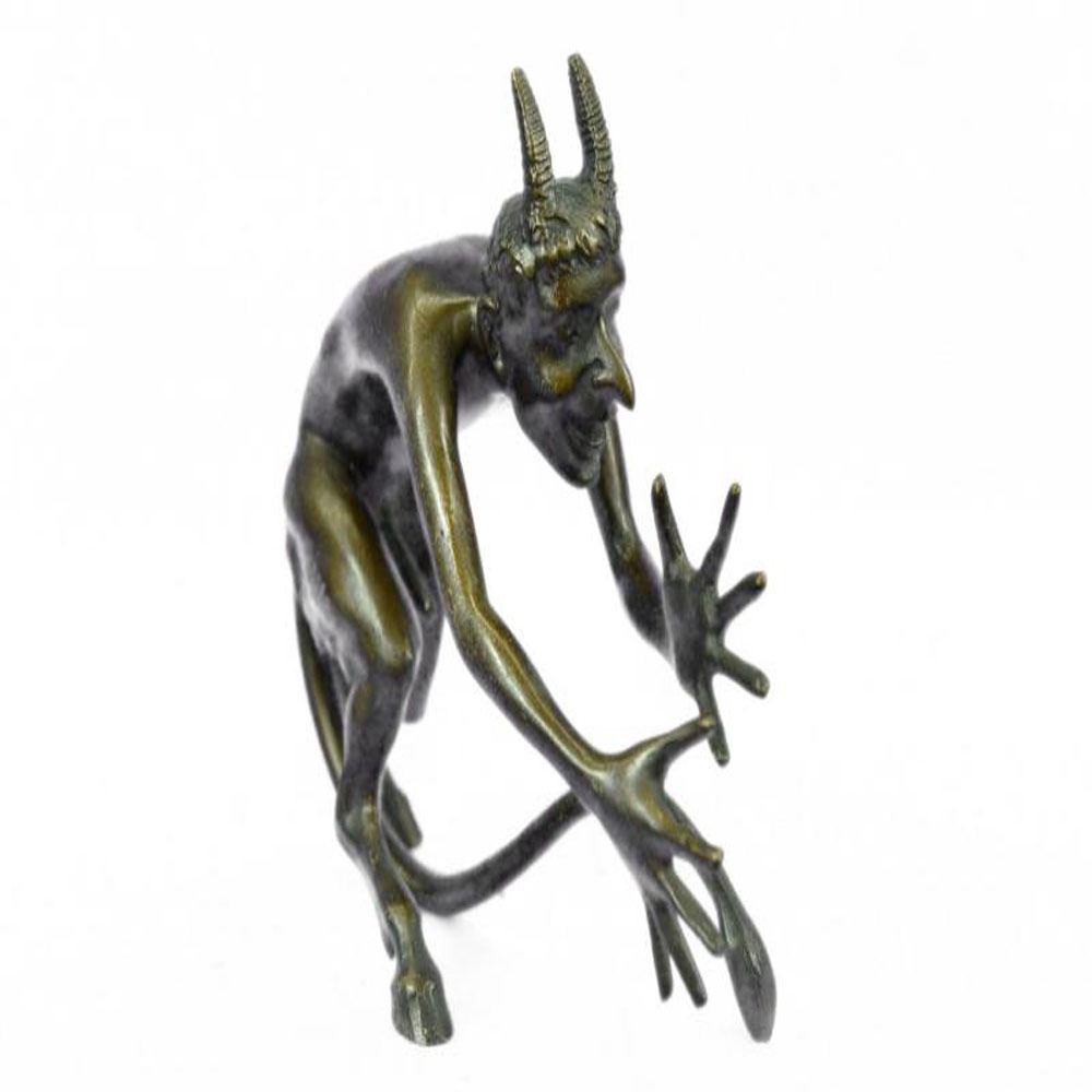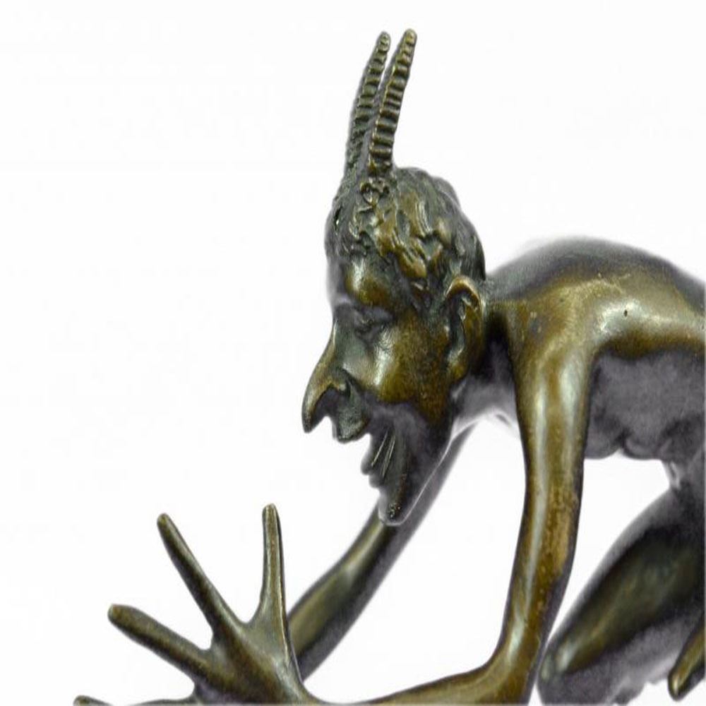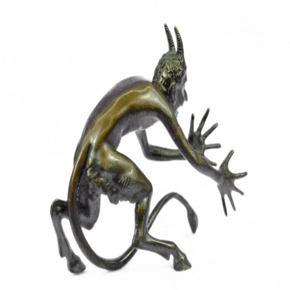 This creepy and very scary satyr is chasing around a nymph, but she is not interesting in him and his overly persisting arouse self. She is happy with her main Satyr, but has not taking no for an answer chasing her all around. His arms and hands are extended and spread out as he is trying to grab something or someone. His devil face and horns are very frightening to look at. This Satyr mythological creature could not be completely understand. This Sculpture is made from solid Bronze and was casted using the Lost Wax Method. It has a brown patina for preservation. Bronze Dimensions: Height 5 X Width 7 inches. Weight: 3 LBS.