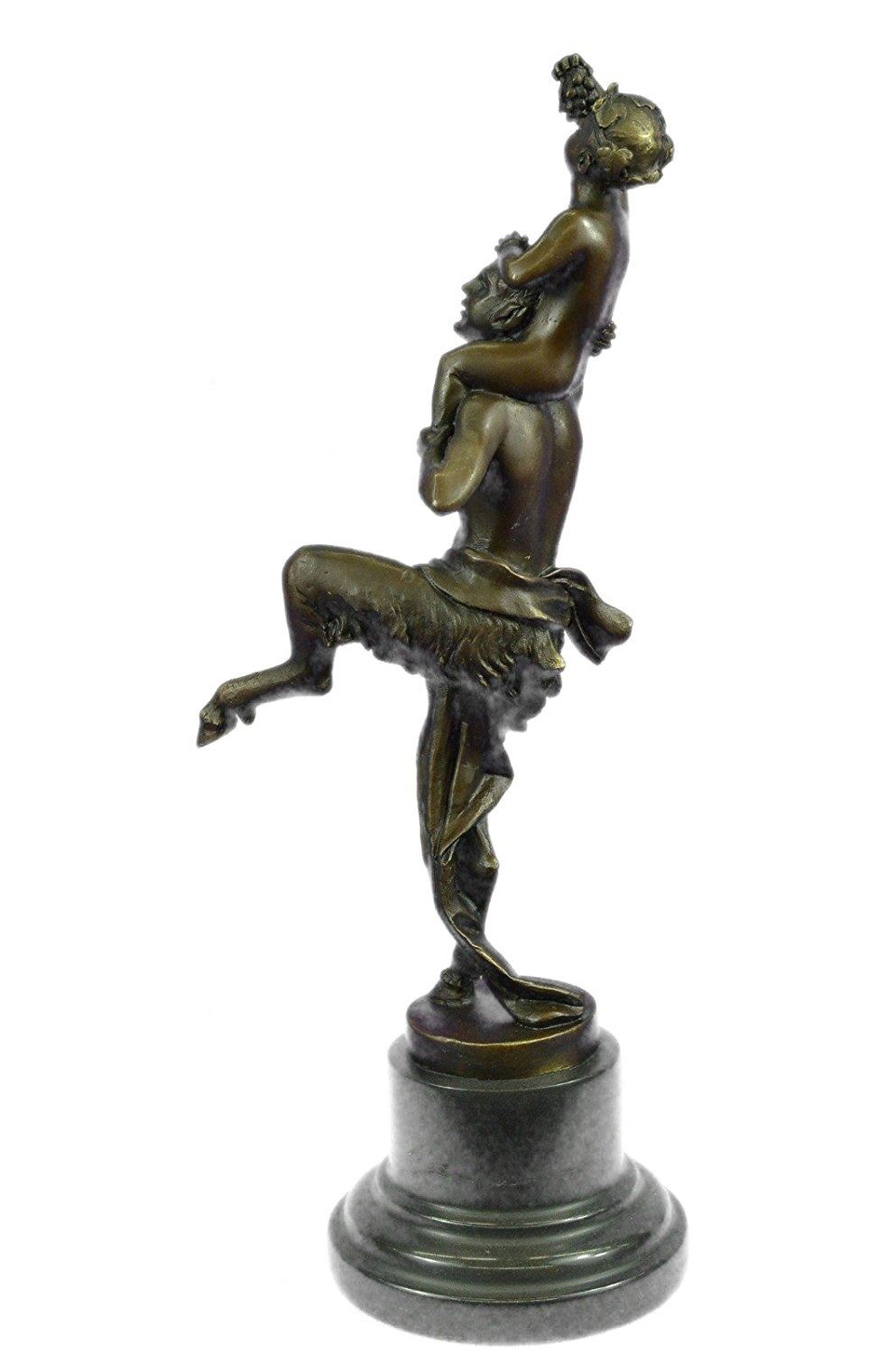 This Sculpture of a satyr hopping around on his goat feet and muscular legs. He carries a little boy on his back and plays with him as he skips through the mountains. While the satyr climbs up the hill, the little boy is drinking water. He has a robe that only covers his lower region. This Satyr and young boy are deep in there game with each other that no other mythological creature could understand. This heavy Sculpture is made from solid Bronze and was casted using the Lost Wax Method. It has a brown patina and is mounted atop of a marble base. Bronze Dimensions with Marble Base: Height 14 X Width 8 inches. Weight: 9 LBS.