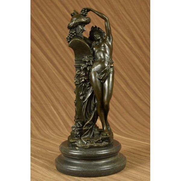 She tries her hardest to control herself against the temptation but caves in. She throws herself on to the sculpture and clutches on no resistance. She is in pure frustration as all she tries to do is become one with the satyr sculpture. Although he is a statue he still smiles and smirks making the nymph more frustrated then she already is. This sculpture is call frustration, the satyr continuously tempts her and there is nothing she can do but be a fool for him. She wears nothing but a long flowing robe that caresses the front of her body and falls down and wraps around the sculpture. Beautiful Ivy crawls up the sides of the pedestal on which the satyrs head sits on. In the satyrs hair you can see two horns and bushels of grapes. This sculpture was cast using the lost wax method and has a gorgeous two tone brown patina. Bronze dimensions with marble base: Height 14 X Width 6 inches. Weight: 13 lbs.Please Note: This is a reproduction bronze sculpture from the original molded and signed. This featured bronze sculpture is a recast after the original, and has been done recently. This 100% bronze sculpture is an abstract piece certain to be a conversation piece.Please Note: This is a reproduction bronze sculpture from the original molded and signed. This featured bronze sculpture is a recast after the original, and has been done recently. This 100% bronze sculpture is an abstract piece certain to be a conversation piece.