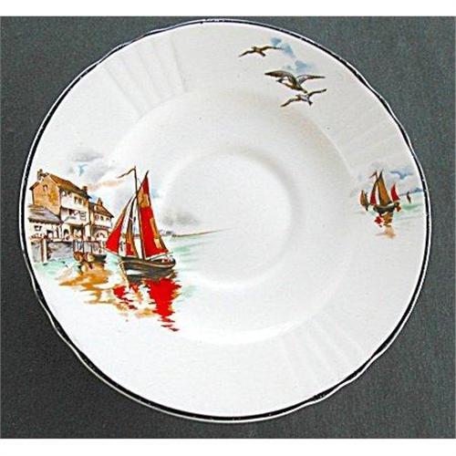 Set of 4 colorful Myott Staffordshire saucers in the Vandyke pattern. Bright orange sailing ship with harbor enhance these Art Deco period saucers. 2 are in nice condition but 2 have a tiny chip on edge under the rim. I have the sugar and one plate to match on my site.