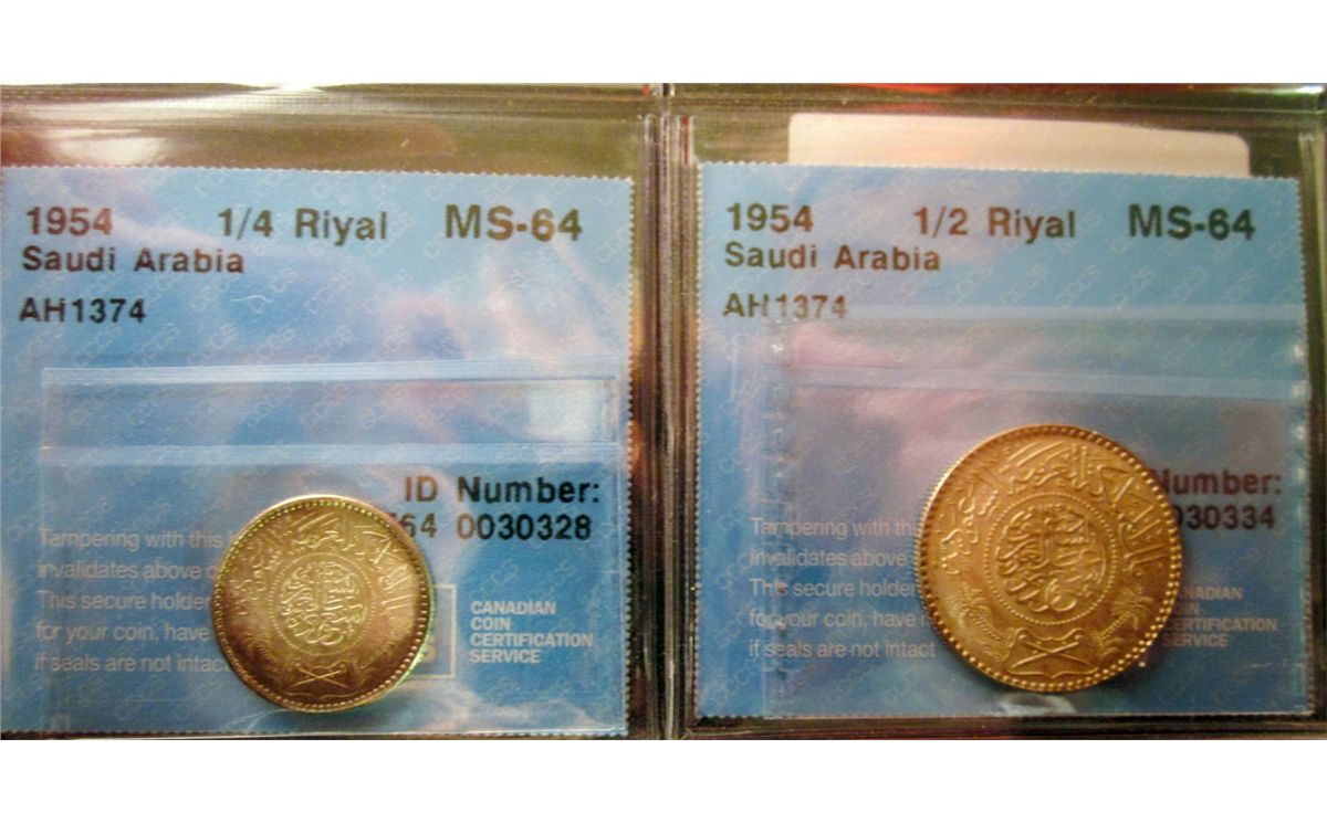 Saudi Arabia; 1/4 Riyal 1935 AH1354 CCCS MS-64 & 1/2 Riyal 1954 AH1374 CCCS MS-64. Lot of 2 coins