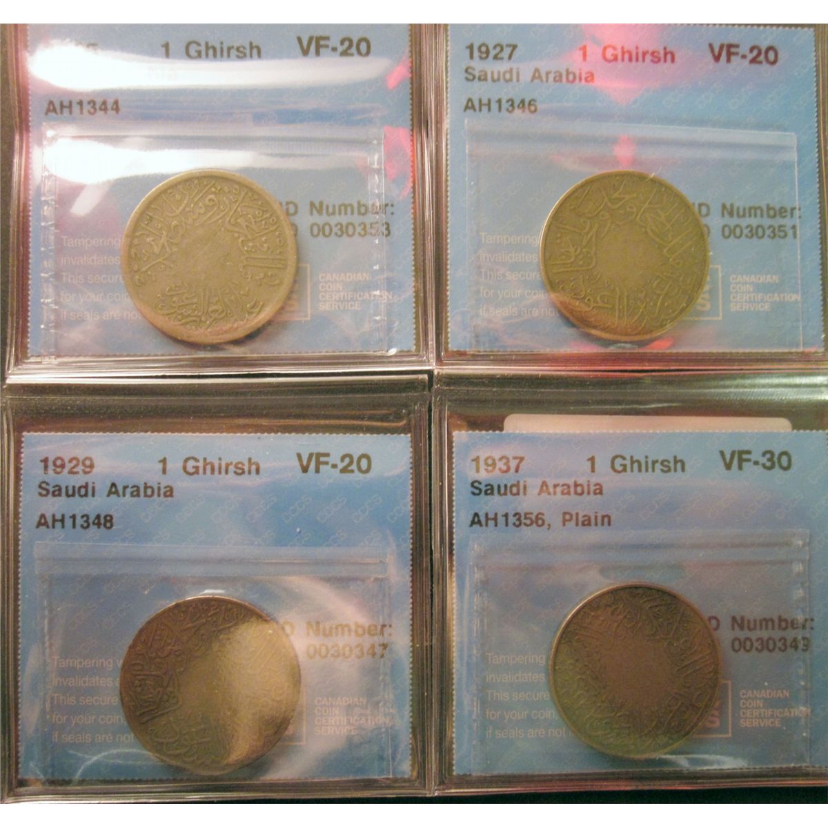 Saudi Arabia; 1 Ghirsh 1925 AH1344 VF-20, 1927 AH1346 VF-20, 1929 AH1348 VF-20 & 1937 AH1356 VF-30; Plain, all coins certified CCCS. Lot of 4 coins.