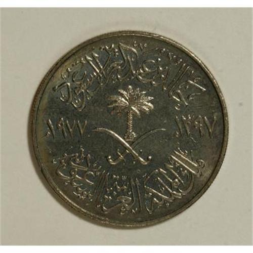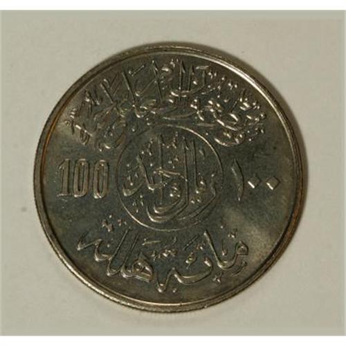 <B>Khalid bin Abdal Aziz 100 Halala 1977 - 1397AH,</B></I> KM59, lightly toned UNC, struck at the British Royal Mint for inclusion in the worldwide FAO sets, but a few were released into circulation in Saudi Arabia. Only about 200 are believed to exist and choice examples are becoming increasingly difficult to obtain as local Saudi collectors and Ebay buyers scramble to complete their collections. Certainly the key coin to the modern Saudi series and a coin with great upside potential. The regular issue of this type is dated 1978 - 1398AH. Value in BU in the SCWC is $325.<BR><BR><b>Shipping:</b> Coins & Currency (<a target="_blank" href="http://www.heritageauctions.com/common/shipping.php">view shipping information</a>)