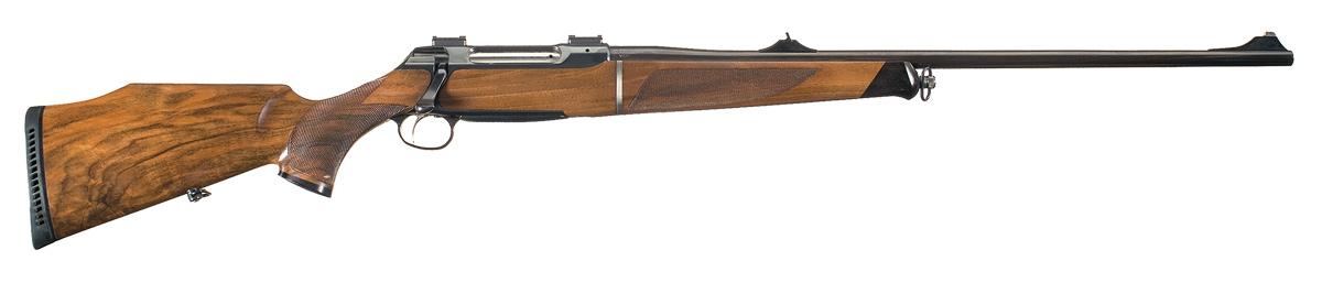 This is a true takedown rifle introduced in 2003. The barrel is equipped with a ramped blade front and ramped rear sights and the top of the receiver is mounted with scope based. Standard markings, flat bolt handle, upper tang and trigger safety, detachable magazine and mounted with a three piece checkered fancy Turkish walnut stock with a rosewood forend, plastic grip cap, cheek piece and vented Sauer recoil pad. Complete with the original box numbered to the gun.