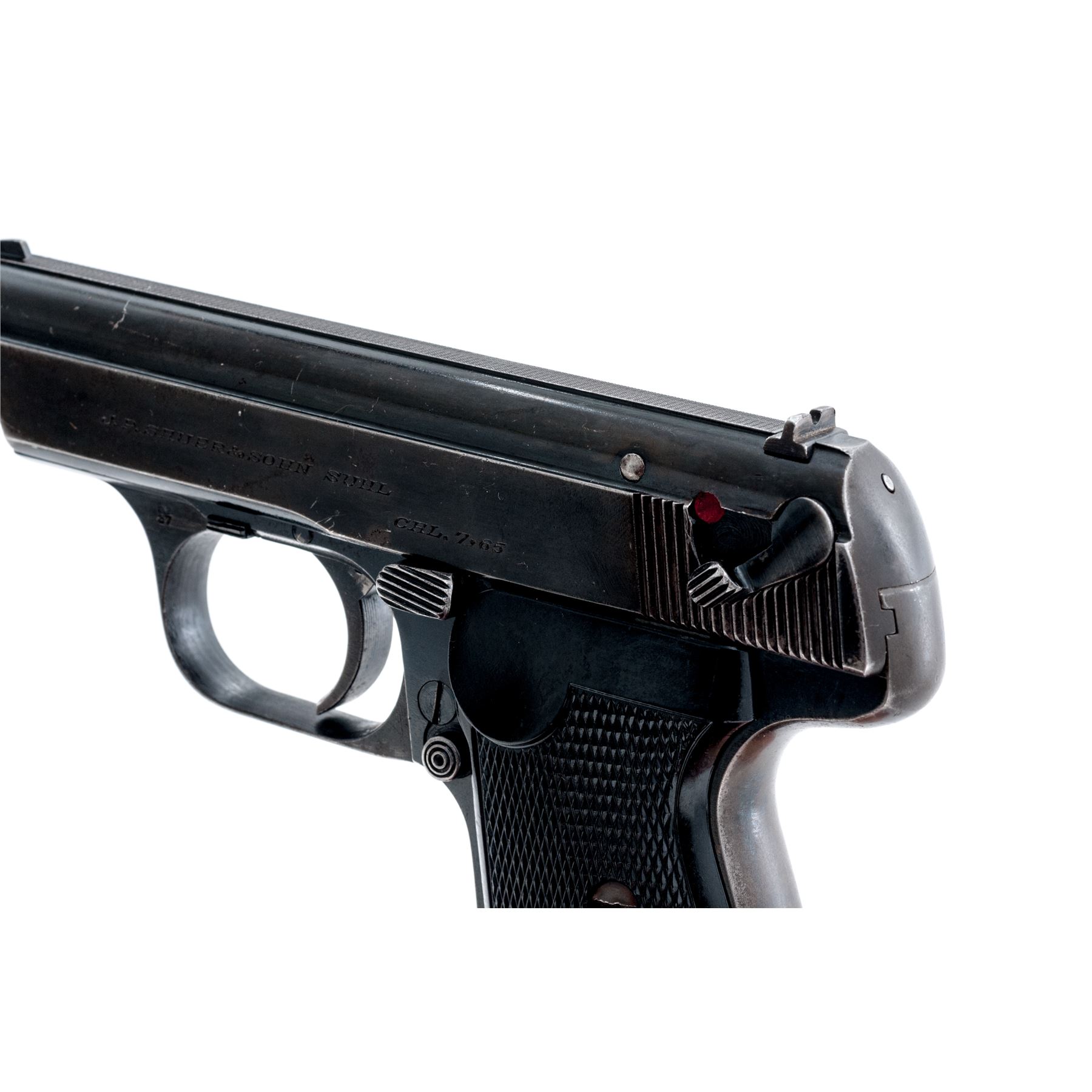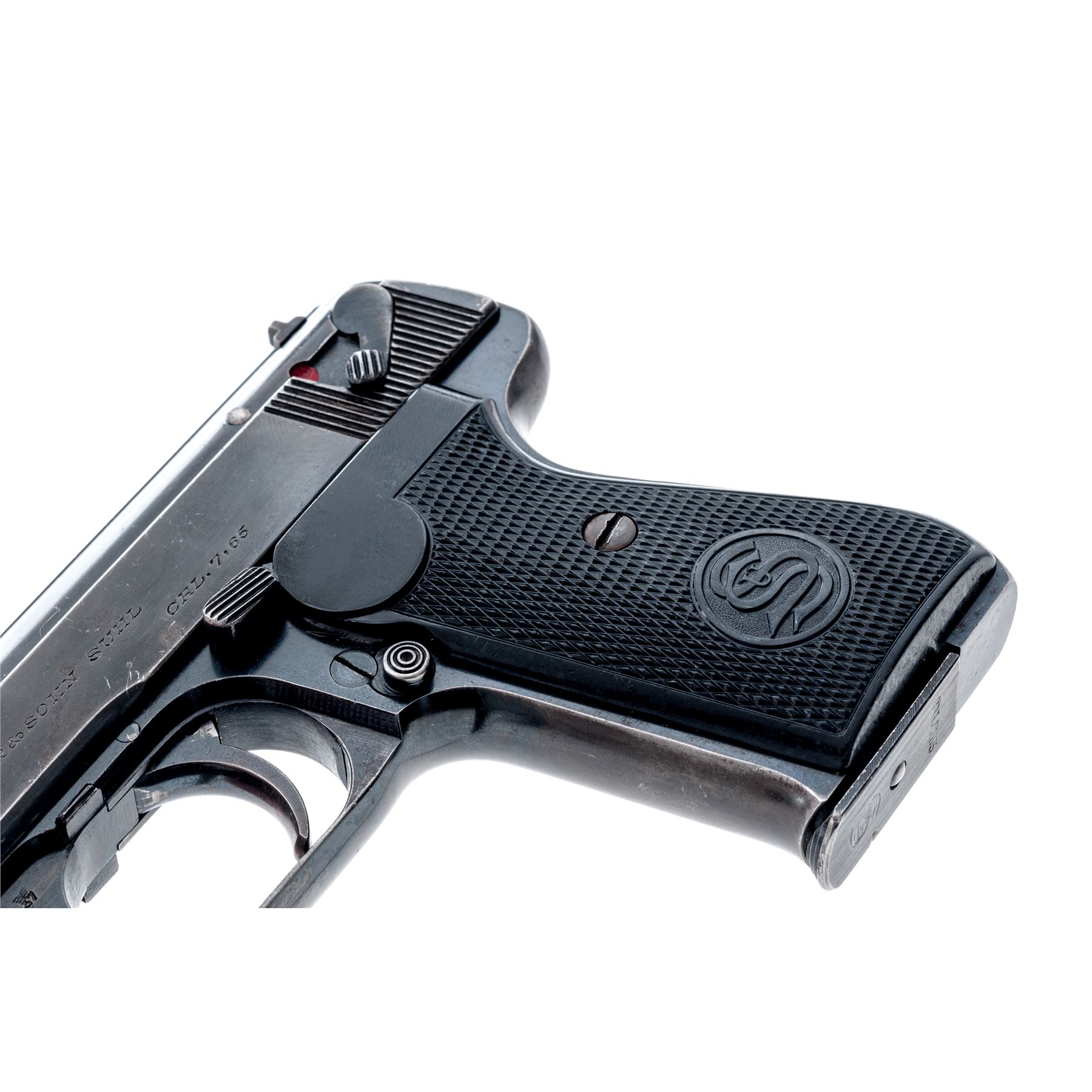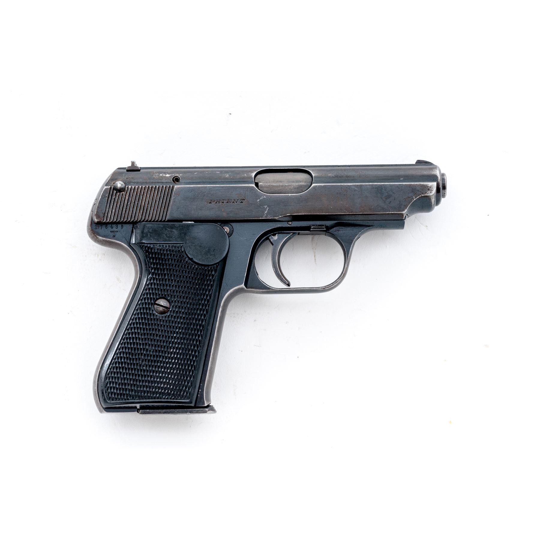 Sauer & Sohn Model 38H Semi-Automatic Pistol, with holster, #276439, .32 ACP cal., 3.25'' barrel, blue finish, checkered phenolic resin grips, one factory magazine, and WWII era brown leather holster, with ''WaA938'' ampt and dated 1943. Frame with ''(eagle)/N'' proofmark, with ''(stick eagle)/37'' markings to left side triggerguard bow. Condition is about fine retaining approx. 90% thinning blue to slide; front and backstrap have thinned to approx. 40%. Grips with only the lightest flattening. Good action, bright bore. Holster with even darkening overall, and some loose stitching to hold-down tab. Est.: $450-$650. (C&R/PPT)