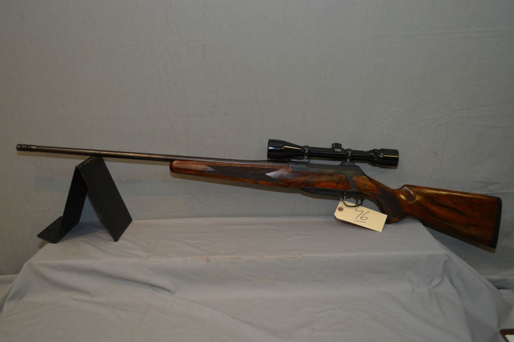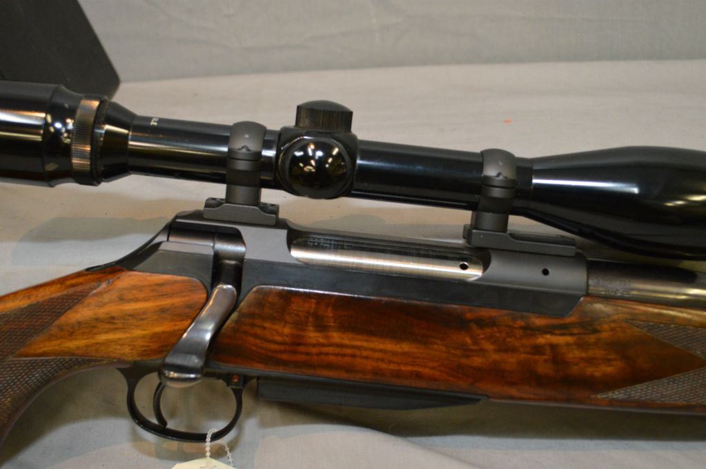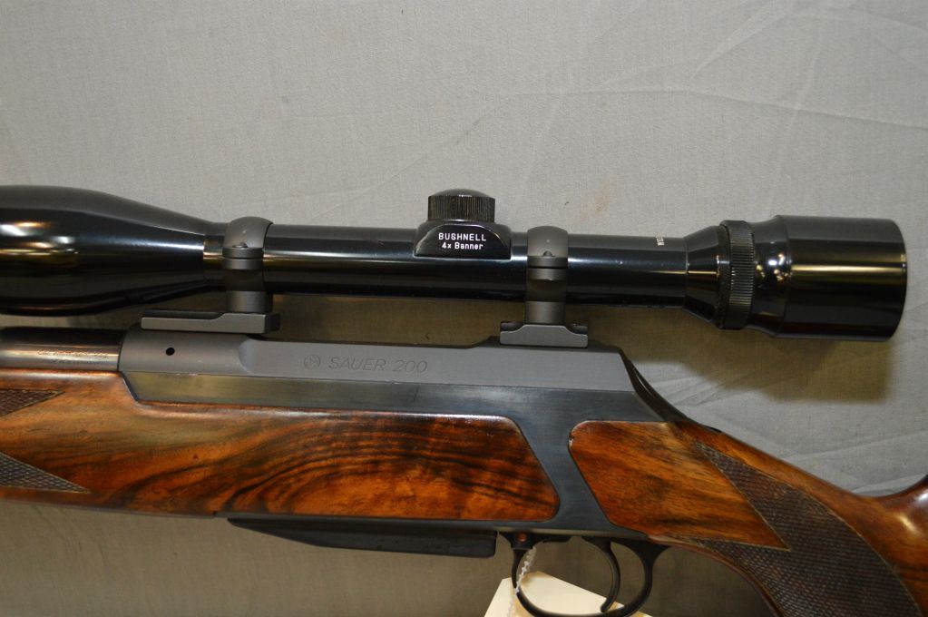 Sauer ( W.Germany ) Model 200 .7 MM Rem Mag cal Mag Fed Bolt Action Rifle w/ 26" bbl w/ screw on muzzle break [ appears excellent, blue finish, no sights, also fitted w/ Bushnell Banner 4X Wide angle scope in deluxe rings & bases, swollen checkered pistol grip stock w/ Sauer recoil pad, spoon bolt ] Ser # H16539
