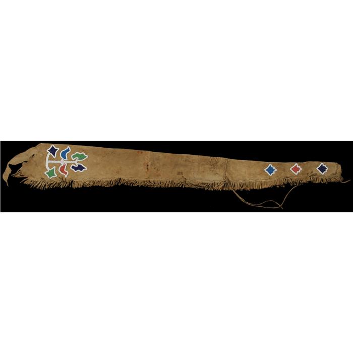Rare Sauk Fox Gun Scabbard. 43" long. Early buffalo hide case. Beadwork at both ends and both sides. C. 1870 (est $ 6,000-9,000)