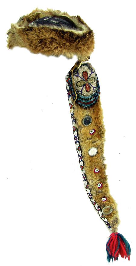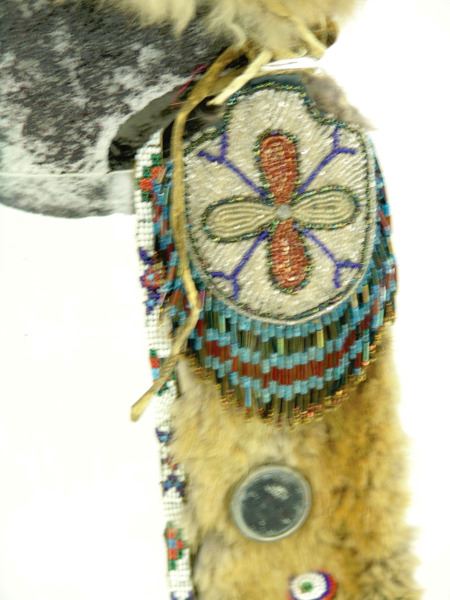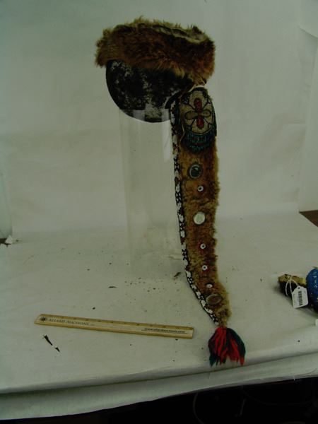 Early/Mid 1900s, Single headband with long tail, both made from fur and with beaded rosettes, mirrors, and woolen tuft. Fair condition. Adult-sized
