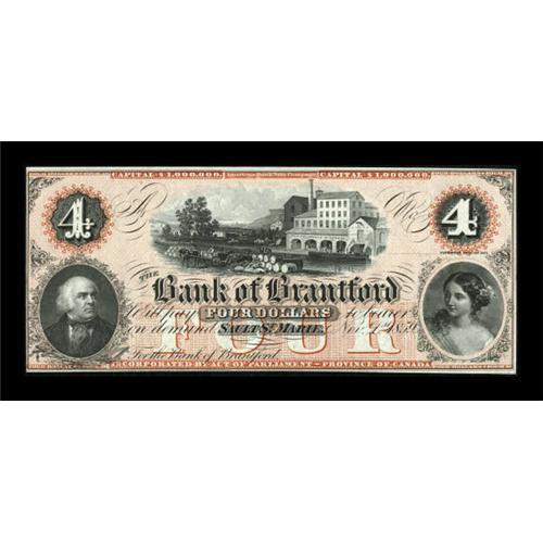 <B>Sault St. Marie, CW- The Bank of Brantford</B></I> $4 Nov. 1, 1859 Ch. # 40-12-06R<BR> This is the scarcest denomination of this remainder issue. Like its siblings above, this note is fully red tinted and payable at Sault St. Marie. Bright <B>Crisp Uncirculated.</B></I><BR><I>From The Thomas M. Flynn Collection</B></I><BR><BR><b>Shipping:</b> Coins & Currency (<a target="_blank" href="http://www.heritageauctions.com/common/shipping.php">view shipping information</a>)