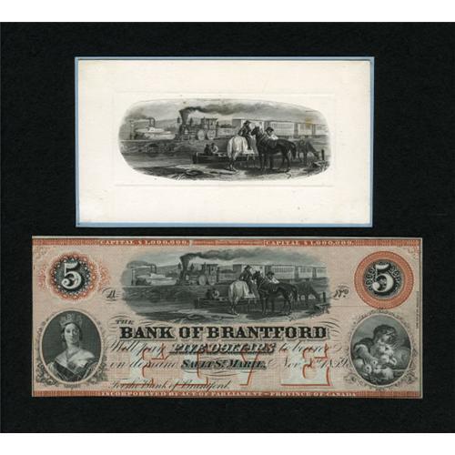 <B>Sault St. Marie, Canada West- Bank of Brantford</B></I> $5 Nov. 1, 1859 Charlton 40-12-08R<BR> This is only the second note we have been able to offer from this Canadian chartered bank. This bank failed in the 1860s. Included with this lot is an approximate 5.5 by 3 inch<B> </B></I>card that also holds the central vignette train engraving.<B> </B></I> <B>Choice Crisp Uncirculated.</B></I><I><BR>From The John Ameen Collection</B></I><BR><BR><b>Shipping:</b> Coins & Currency (<a target="_blank" href="http://www.heritageauctions.com/common/shipping.php">view shipping information</a>)