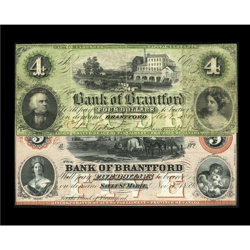 <B>Sault St. Marie, ON- Bank of Brantford</B></I> $4; $5 Nov. 1, 1859 Ch. 40-12-06; 08 R<BR>Most of the notes for this Canadian bank were issued in the United States. The $4 grades <B>Fine,</B></I> missing corner tip and the $5 grades <B>Choice CU.</B></I><BR><I>From The Halton Lake Collection</B></I>