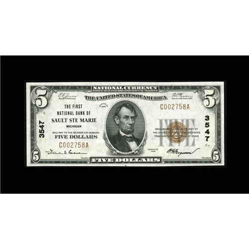 <B>Sault Ste Marie, MI</B></I> - $5 1929 Ty. 1 <B>The First NB</B></I> Ch. # 3547<BR>A crackling fresh example with great centering and full originality. <B>Gem Crisp Uncirculated.</B></I>