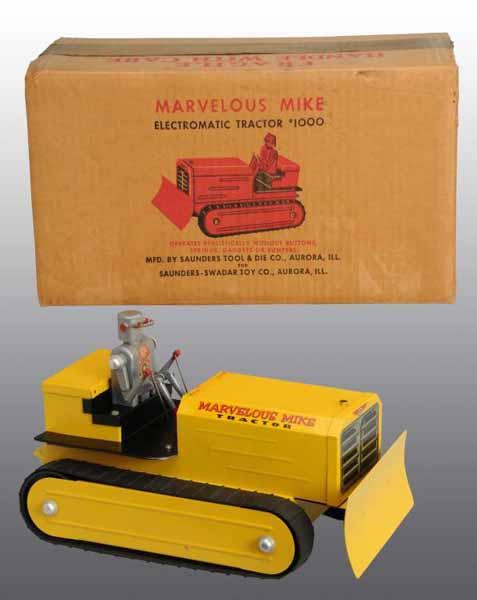 Description Circa 1950s. Decals on side read "Marvelous Mike Tractor". Very minor wear with some chipping to one decal. Includes original box marked "Electromatic Tractor 1000" along with cardboard inserts. Condition (Excellent). Size 13" L.