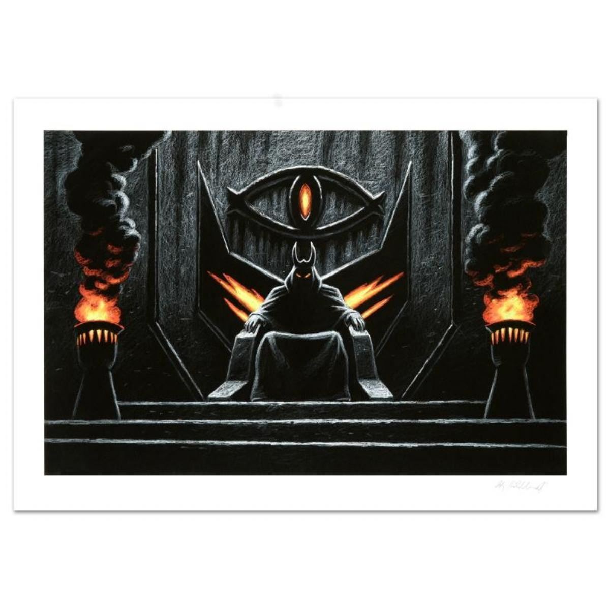 Known world wide for his fantasy and science fiction illustrations, Greg Hildebrandt has created an abundance of fascinating artwork including, and most notably his illustration work for J.R.R. Tolkien's 'The Hobbit' and 'Lord of the Rings'. "Sauron The Dark Lord", originally created in the 1970's for Ballantine Books, is a limited edition giclee on paper, numbered and hand signed by Greg Hildebrandt! Includes Certificate of Authenticity! Measures approx. 34" x 23.5" (with border), 30" x 19.5" (image).