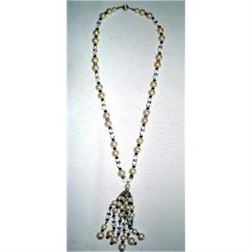 I can remember these sautoir necklaces coming back into faship during the late 1950's and 1960's ! This one is very special. It has large 10m pearl color beads, tiny french jet black spacer beads, pyramid shaped faceted clear glass beads generously sprinkled with many small rhinetone rondels, both along the length of the necklace and in the six strand sautoir, which is metal strung. The length of the necklace (not including the sautoir) is 23-1/2" inches and the length of the sautoir is 3-3/4" inches. Total drop or hanging length is 15" inches. The clasp is a small etched machine turned silvertone bead with a slip lock prong type close. Lovely silvertone filigree work on the cap above the sautoir strands. All in all a very spectacular necklace and an absolute must have for your next party!