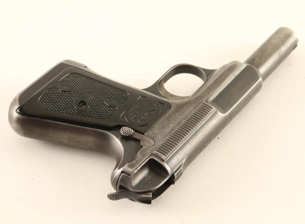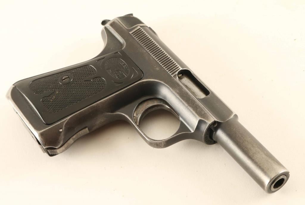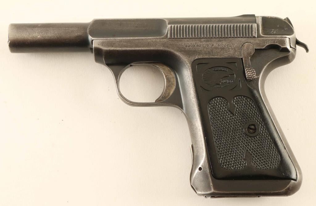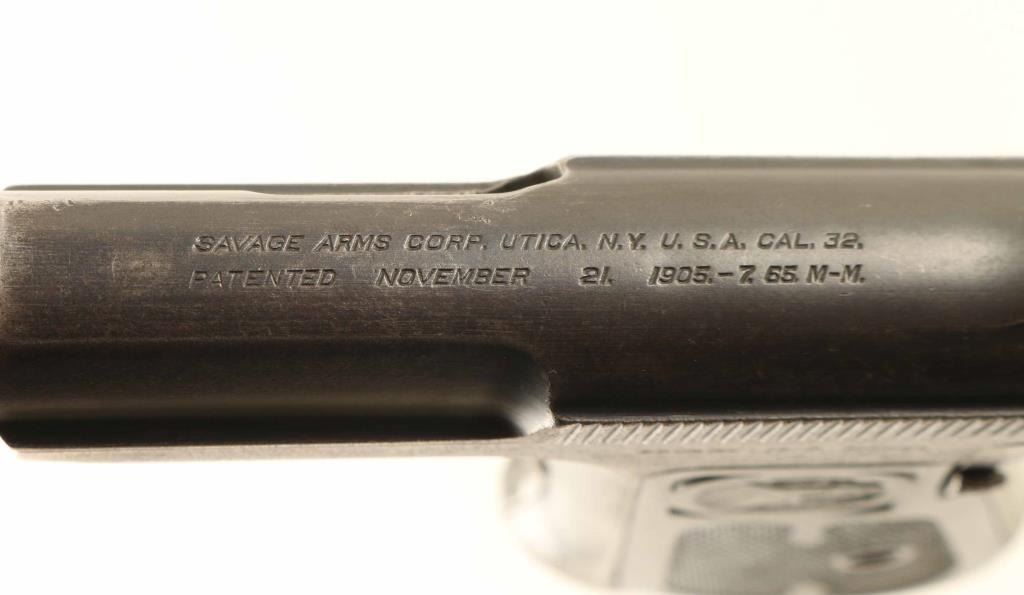 Vintage American made striker fired semi-automatic compact pistol chambered in 7.65mm, manufactured circa 1921. Features a blued finish, 3.75" barrel, removed front sight, fixed rear sight, smooth trigger, serrated cocking lever, manual safety/slide catch on the left side of the frame, toe magazine release, 10 round magazine, steel frame and two-piece fancy checkered black synthetic grips with Savage insignias. The address/patent mark on the slide reads "SAVAGE ARMS CORP. UTICA, N.Y. U.S.A. CAL. 32./PATENTED NOVEMBER 21. 1905.-7.65.M-M." Pistol exhibits approximately 30% of it's original blued finish with the balance of the metal surfaces in-the-white showing some scattered pin prick pitting. Action is crisp, the bore is fair with pin prick pitting & a dark ring forward of the chamber, markings are good and the synthetic grips are good to very good. Condition is near NRA Good. ***C&R Firearm***